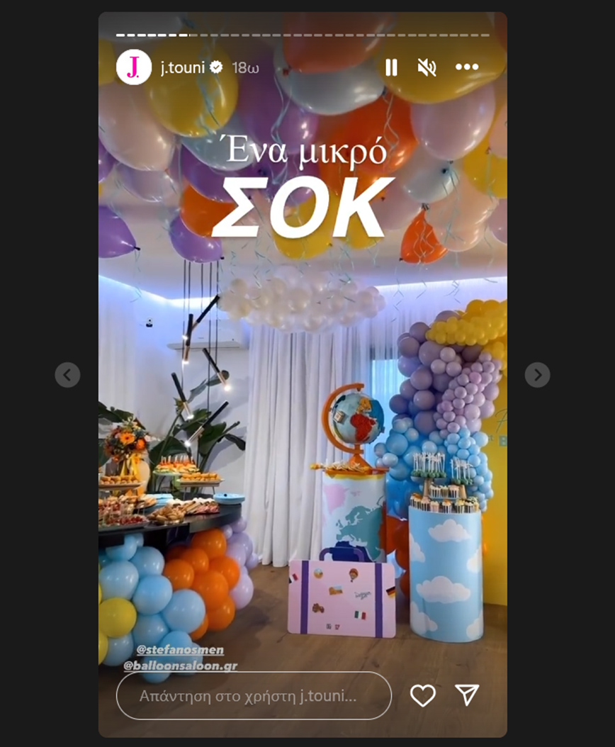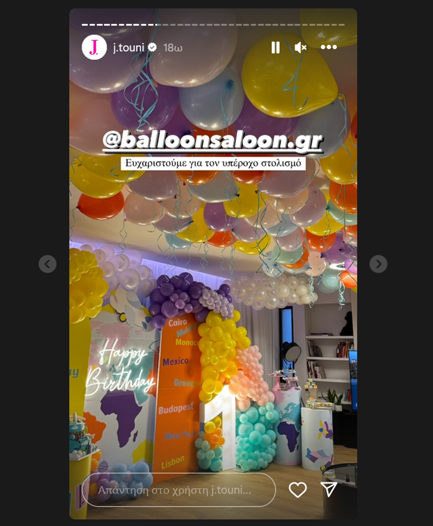 Το πάρτι ήταν travel theme, εμπνευσμένο από τα ταξίδια και τις χώρες, που έχει επισκεφθεί ο μικρός Πάρης με τους γονείς του, λίγους μήνες μετά τη γέννησή του. Το σπίτι ήταν γεμάτο εντυπωσιακά, πολύχρωμα μπαλόνια και χρώματα, για να ταιριάζει με το σκηνικό που ήθελαν.