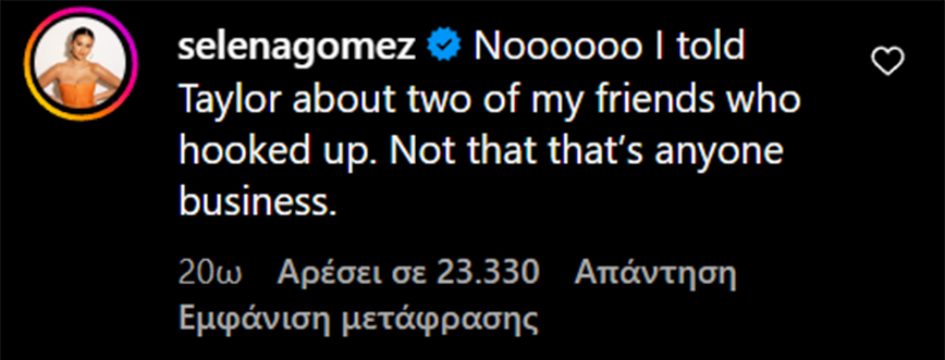Ωστόσο, η Σελένα έσπευσε να ξεδιαλύνει το τοπίο, γράφοντας στη δημοσίευση του E! News στο Instagram: «Όχι, είπα στην Τέιλορ για δύο φίλους μου που τα έφτιαξαν. Όχι ότι αυτό αφορά κανέναν».