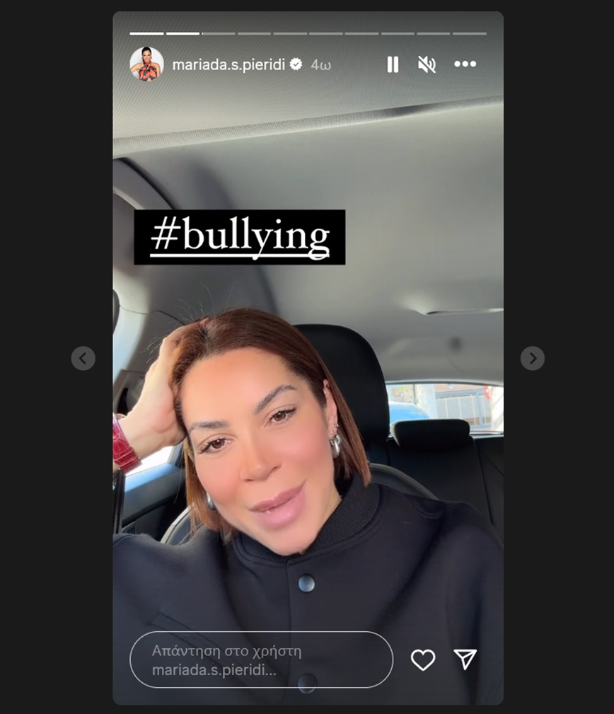 «Καλημέρα σε όλους και όλες. Λοιπόν, γιατί κάνω αυτό το story; Θέλω την άποψή σας για κάτι που αντιμετωπίζω από την Α’ Δημοτικού που ξεκίνησε ο μικρός το σχολείο… Σε ένα σχολείο, που στο παρελθόν τουλάχιστον, υπήρξε εξαιρετικό. Αντιμετωπίζω πολύ σοβαρό θέμα bullying. Από την πρώτη Δημοτικού. Το πρώτο σοβαρό θέμα που αντιμετώπισα ήταν μολύβι στον κρόταφο, μέσα στο κρέας. Ένα από όλα ήταν αυτό. Στη συνέχεια, υπήρξαν κλωτσιές στα μούτρα, ο παππούς του τον είδε να είναι ξαπλωμένος στο προαύλιο και να τον κλωτσάει το παιδάκι στην κοιλιά χωρίς λόγο την ώρα που έπαιζαν μπάσκετ. Απλά για να πάρει την μπάλα, θεώρησε ότι πρέπει να κάνει αυτό. Θέλω την άποψή σας πάρα πολύ», ανέφερε αρχικά η τραγουδίστρια. Αφού διάβασε τις απαντήσεις, είπε πως αναγκάστηκε να στείλει το παιδί της να μάθει αυτοάμυνα, για να υπερασπίζεται τον εαυτό του.