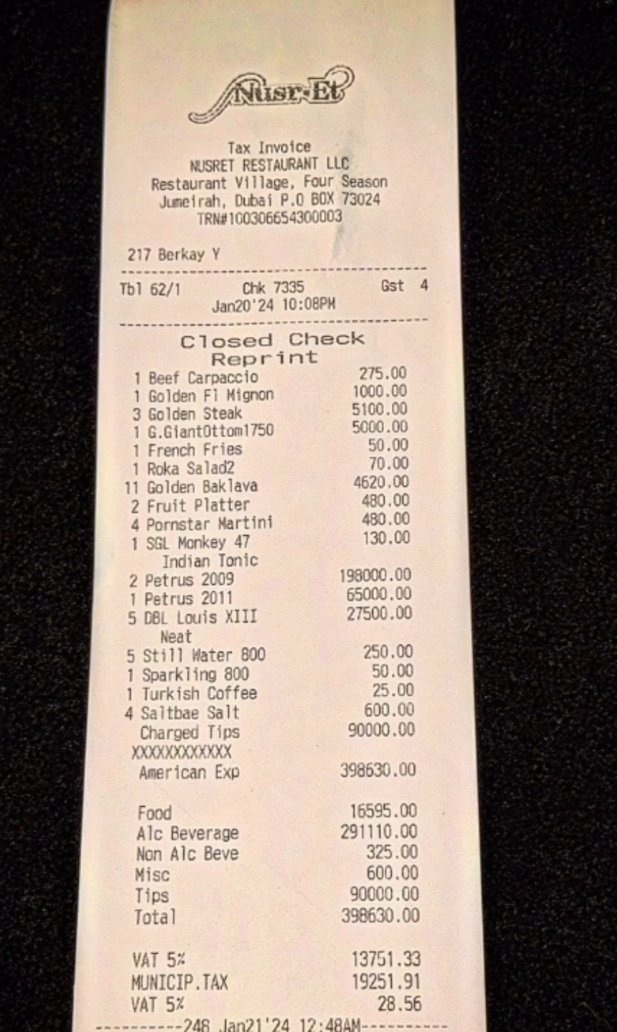 Απόλαυσαν, επίσης, πολυτελές κρέας με επικάλυψη χρυσού, συμπεριλαμβανομένου ενός φιλέτου μινιόν (270 δολάρια), και τρεις μπριζόλες (1.390 δολάρια). Συνόδευσαν τα φαγητά τους με τέσσερα μαρτίνι (130 δολάρια), δύο μπουκάλια Chateau Petrus 2009 (53.900 δολάρια), ένα μπουκάλι Petrus 2011 (17.700 δολάρια) και πέντε διπλά ποτήρια του αποκλειστικού κονιάκ Louis XIII (7.500 δολάρια). Έδωσαν επιπλέον 24.500 δολάρια σε φιλοδωρήματα. Το κραυγαλέο καύχημα του Salt Bae δεν άρεσε στους εξοργισμένους σχολιαστές του Instagram. «Αυτή είναι μια περίπτωση που οι άνθρωποι έχουν περισσότερα χρήματα παρά κοινή λογική», δήλωσε ένα άτομο. «Ο ξυλουργός μου μπορεί να μαγειρεύει καλύτερα», έγραψε ένας άλλος.