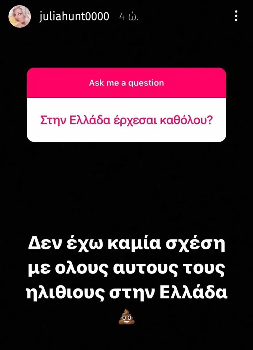 Στην τελευταία σειρά από ερωτήσεις που δέχθηκε, η Τζούλια Αλεξανδράτου ρωτήθηκε από διαδικτυακό της ακόλουθο για το αν έρχεται καθόλου στην Ελλάδα.