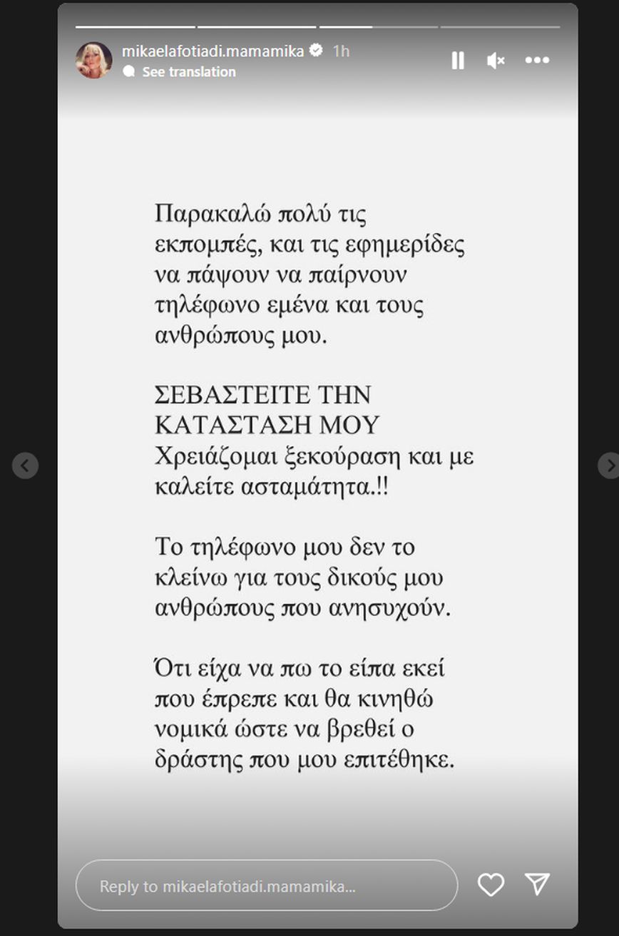 «ΣΕΒΑΣΤΕΙΤΕ ΤΗΝ ΚΑΤΑΣΤΑΣΗ ΜΟΥ! Χρειάζομαι ξεκούραση και με καλείτε ασταμάτητα! Το τηλέφωνο μου δεν το κλείνω για τους δικούς μου ανθρώπους που ανησυχούν. Ότι είχα να πω το είπα εκεί που έπρεπε και θα κινηθώ νομικά ώστε να βρεθεί ο δράστης που μου επιτέθηκε» καταλήγει η Μικαέλα Φωτιάδη μέσα από τη νέα ιστορία που δημοσίευσε στον προσωπικό της λογαριασμό στο Instagram.