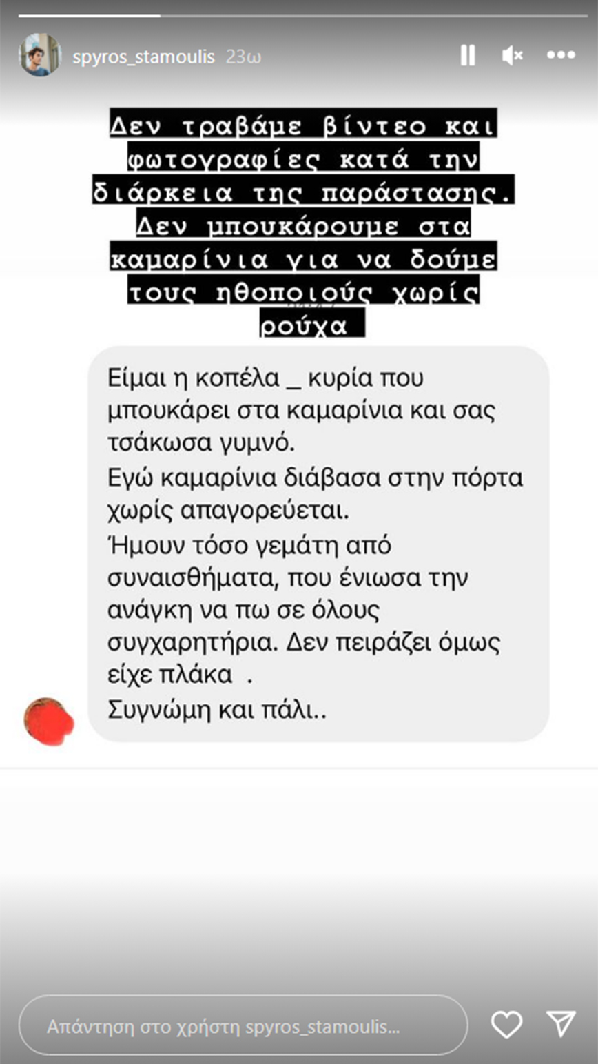 «Είμαι η κοπέλα_κυρία που μπούκαρε στα καμαρίνια και σας τσάκωσα γυμνό. Εγώ καμαρίνια διάβασα στην πόρτα χωρίς απαγορεύεται. Ήμουν τόσο γεμάτη από συναισθήματα που ένιωσα την ανάγκη να πω σε όλους συγχαρητήρια. Δεν πειράζει, όμως, είχε πλάκα. Συγγνώμη και πάλι» τού έγραψε σε μήνυμα με τον ηθοποιό από τη μεριά του να κάνει δημοσίευση και να αναφέρει: