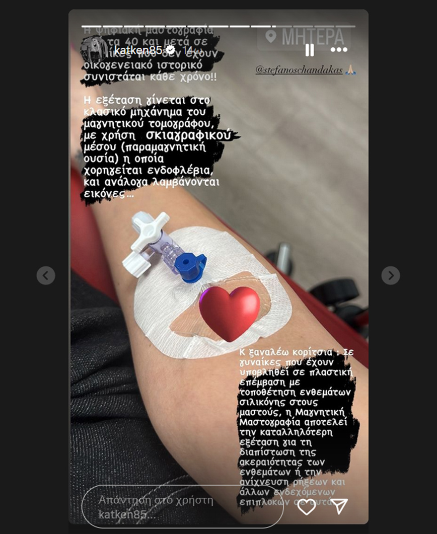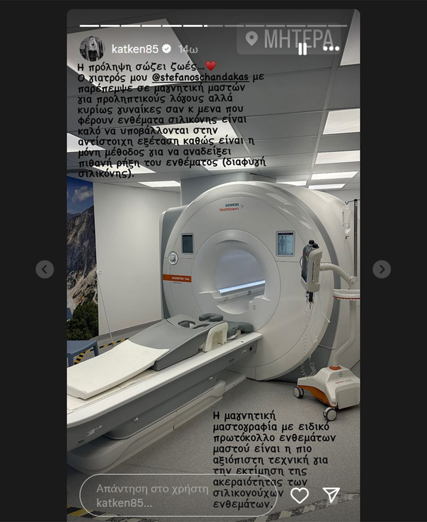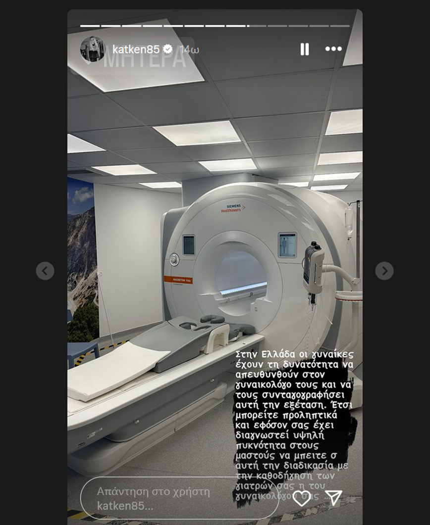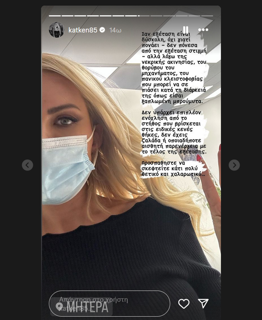 Η Κατερίνα Καινούργιου ανέβασε στον λογαριασμό της στο Instagram ένα στόρι από την εξέταση μαγνητικής τομογραφίας στην οποία υποβλήθηκε, ενώ έστειλε ένα μήνυμα προς τις γυναίκες όλων των ηλικιών.