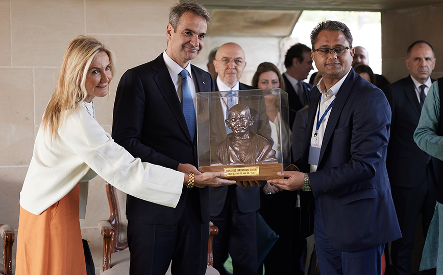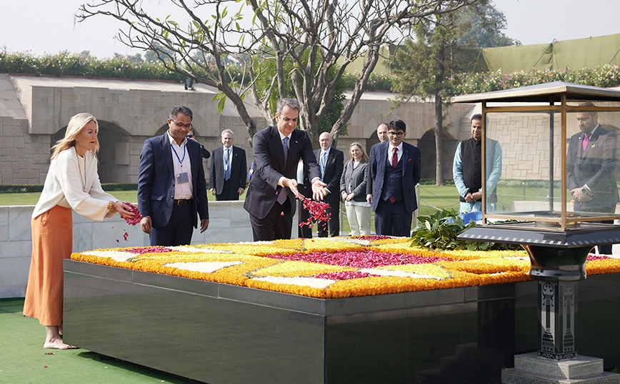 Η Μαρέβα Μητσοτάκη, πάλι, δεν το έκανε τόσο πολύπλοκο, αλλά σίγουρα ήταν επιτυχημένη η κίνησή της, αποσπώντας φιλοφρονήσεις για το ντύσιμό της. Το πρωθυπουργικό ζεύγος κατέθεσε στεφάνι στο μνημείο του Μαχάτμα Γκάντι και άφησαν το δικό τους μήνυμα στο βιβλίο επισκεπτών. Συμμετείχαν, επίσης, και σε μία παραδοσιακή τελετή με λουλούδια, με την κυρία Μητσοτάκη να βγάζει -προφανώς ως είθισται- τα παπούτσια της.