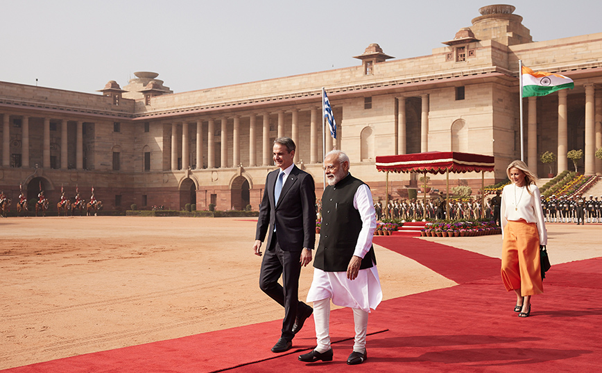 Ο Κυριάκος Μητσοτάκης βρίσκεται στο Νέο Δελχί στο πλαίσιο επίσημης επίσκεψης στην Ινδία. Τον έλληνα πρωθυπουργό συνοδεύει στο ταξίδι η σύζυγός του, Μαρέβα, η οποία τράβηξε τα βλέμματα με την κομψή και συμβολική εμφάνισή της.