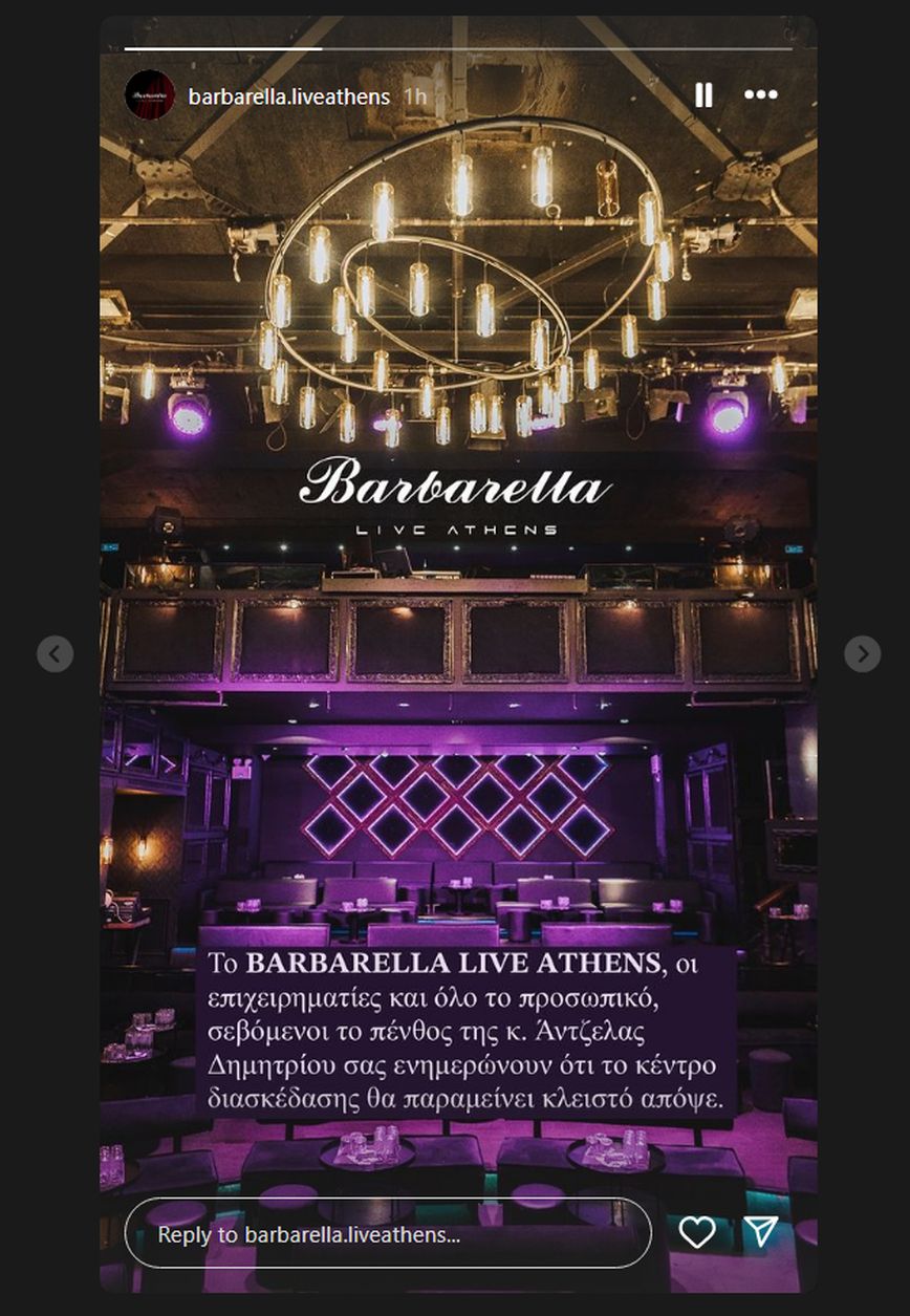 Συγκεκριμένα, στην ανακοίνωσή του, το νυχτερινό μαγαζί αναφέρει: «Το Barbarella Live Athens, οι επιχειρηματίες και όλο το προσωπικό, σεβόμενοι το πένθος της κ. Άντζελας Δημητρίου σας ενημερώνουν ότι το κέντρο διασκέδασης θα παραμείνει κλειστό απόψε».