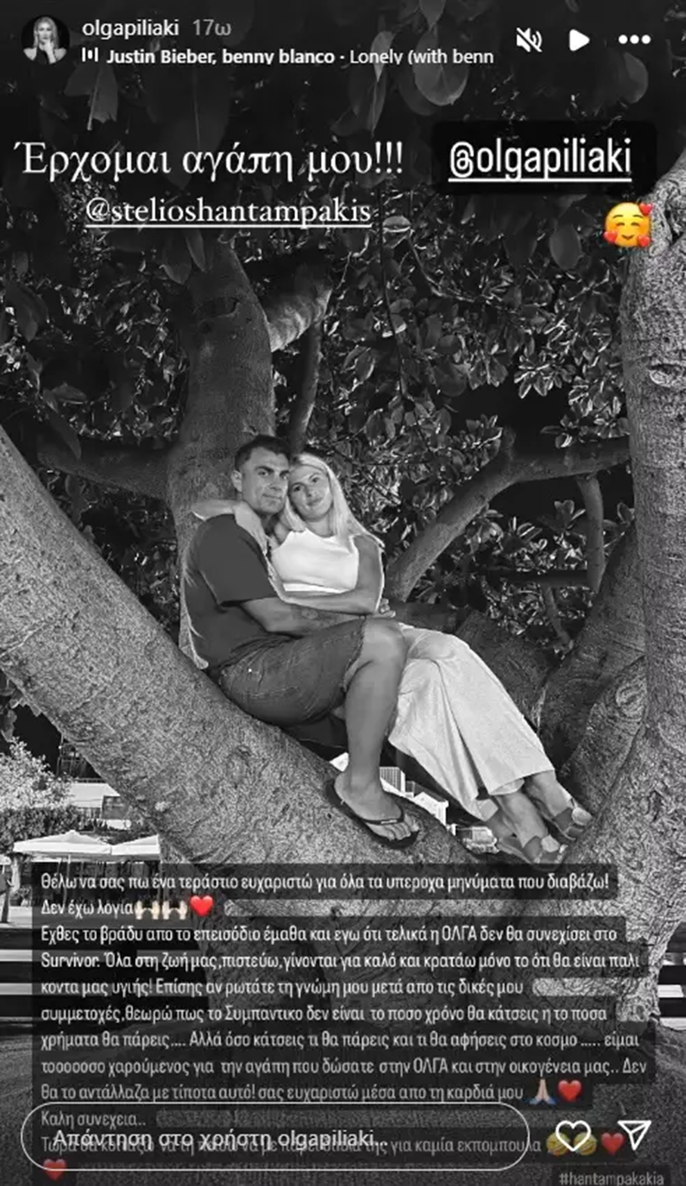 Αρχικά, έκανε ένα story στο Instagram, όπου δημοσίευσε μια φωτογραφία, στην οποία είναι αγκαλιασμένη με το σύζυγό της Στέλιο Χανταμπάκη.