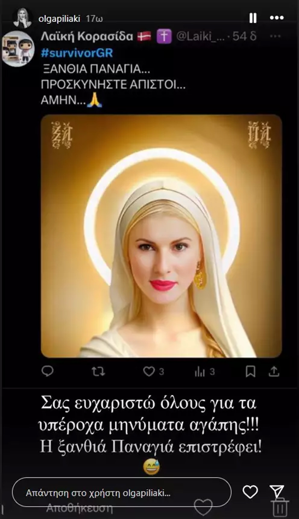 Έπειτα, αναδημοσίευσε μια χιουμοριστική ανάρτηση στην πλατφόρμα Χ, όπου ένας χρήστης την εμφάνιζε ως Παναγία και η ίδια έγραψε τα εξής: