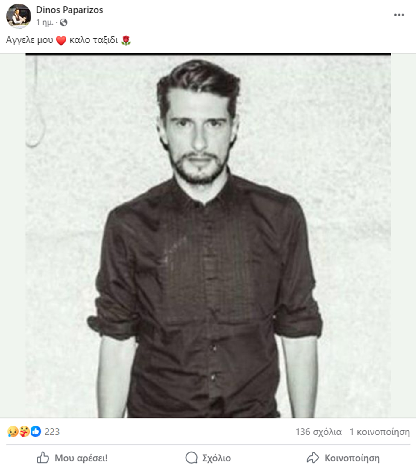 Τον ηθοποιό αποχαιρέτησε με μία συγκινητική ανάρτηση στο Facebook ο αδερφός της Έλενας Παπαρίζου, Ντίνος. «Άγγελέ μου, καλό ταξίδι», έγραψε και δημοσίευσε φωτογραφία του.