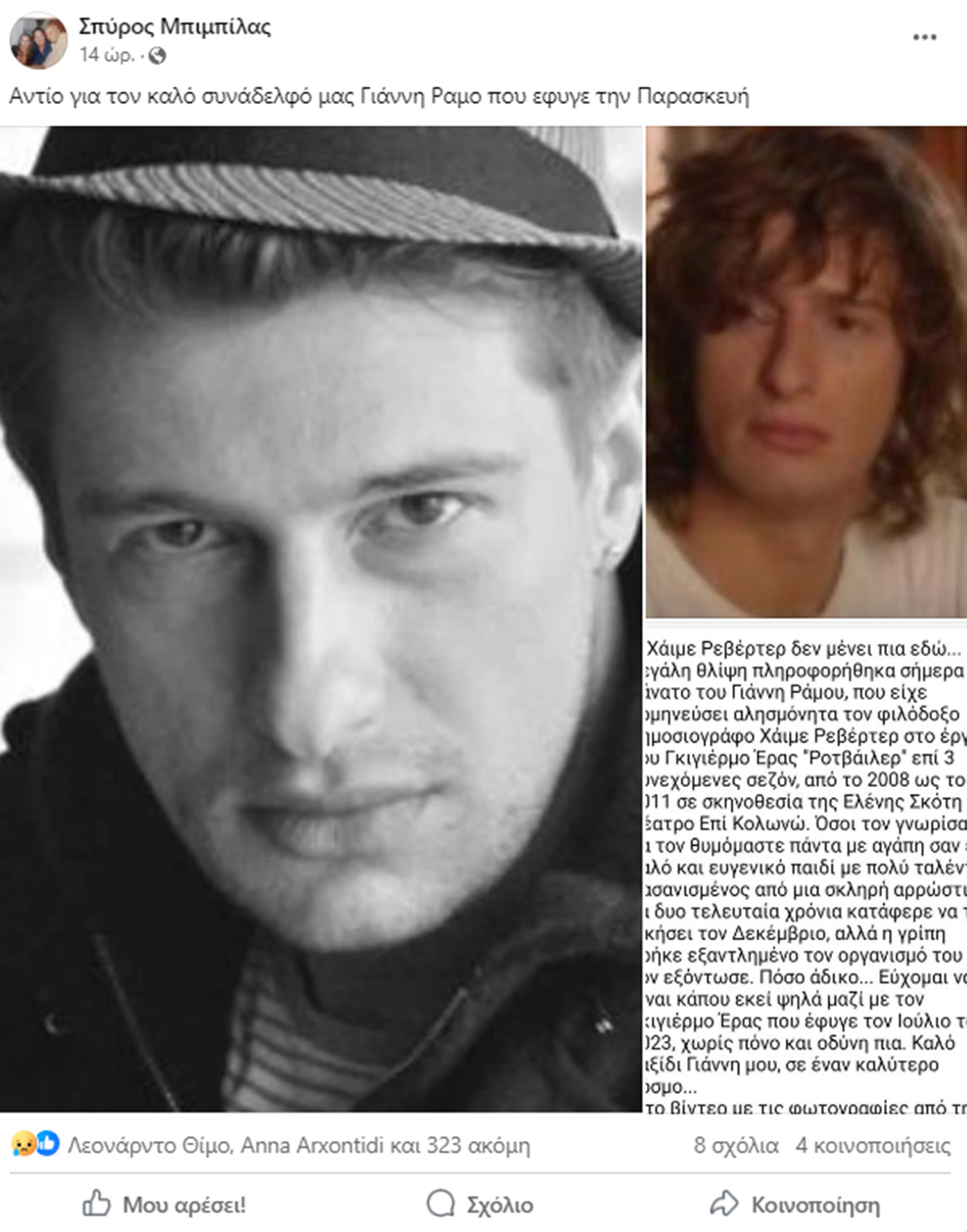 Σε δεύτερή του ανάρτηση για τον Γιάννη Ράμο, ο Σπύρος Μπιμπίλας υπενθυμίζει, επίσης, την ερμηνεία του ηθοποιού στον ρόλο του δημοσιογράφου Χάιμε Ρεβέρτερ στο έργο του Γκιγιέρμο Έρας «Ροτβάιλερ» από το 2008 έως το 2011 και προσθέτει ότι ήταν «βασανισμένος από μια σκληρή αρρώστια τα δύο τελευταία χρόνια κατάφερε να τη νικήσει τον Δεκέμβριο, αλλά η γρίπη βρήκε εξαντλημένο τον οργανισμό του και τον εξόντωσε».