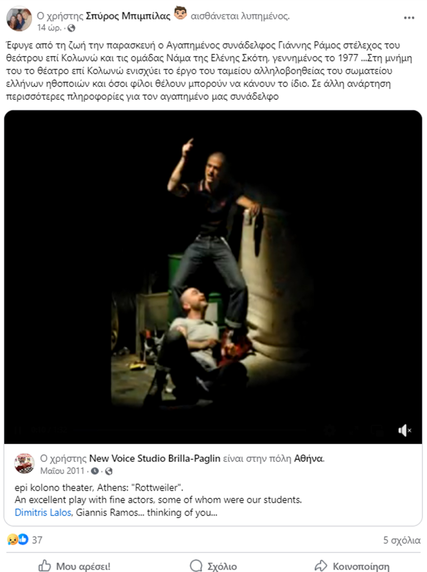 Σε ανάρτησή του ο πρόεδρος του Σωματείου Ελλήνων Ηθοποιών, Σπύρος Μπιμπίλας, επεσήμανε ότι ο Γιάννης Ράμος ήταν «στέλεχος του θεάτρου επί Κολωνώ και της ομάδας Νάμα της Ελένης Σκότη, γεννημένος το 1977», προσθέτοντας ότι «στη μνήμη του το θέατρο επί Κολωνώ ενισχύει το έργο του ταμείου αλληλοβοηθείας του σωματείου ελλήνων ηθοποιών και όσοι φίλοι θέλουν μπορούν να κάνουν το ίδιο».