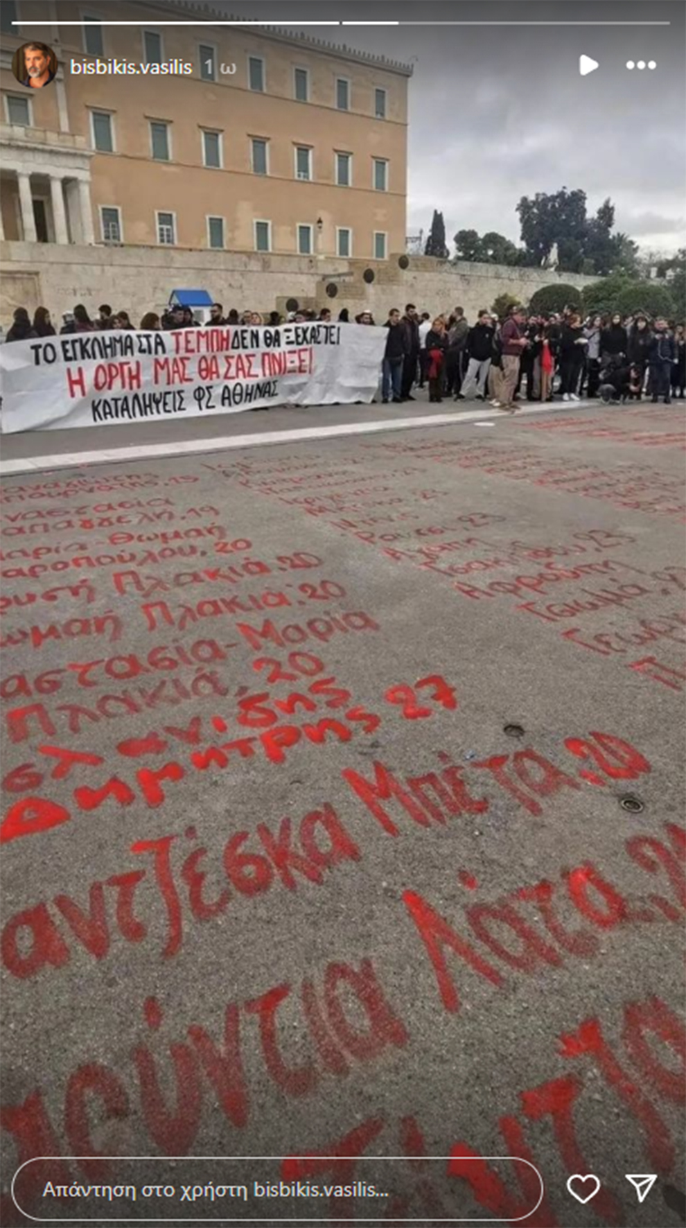 Το «παρών» στην πορεία της Αθήνας έδωσε και ο Βασίλης Μπισμπίκης. Ο ηθοποιός βρέθηκε έξω από τη Βουλή για να διαμαρτυρηθεί για την τραγωδία στα Τέμπη, δημοσιεύοντας σχετικά στιγμιότυπα στο προφίλ του στο Instagram.