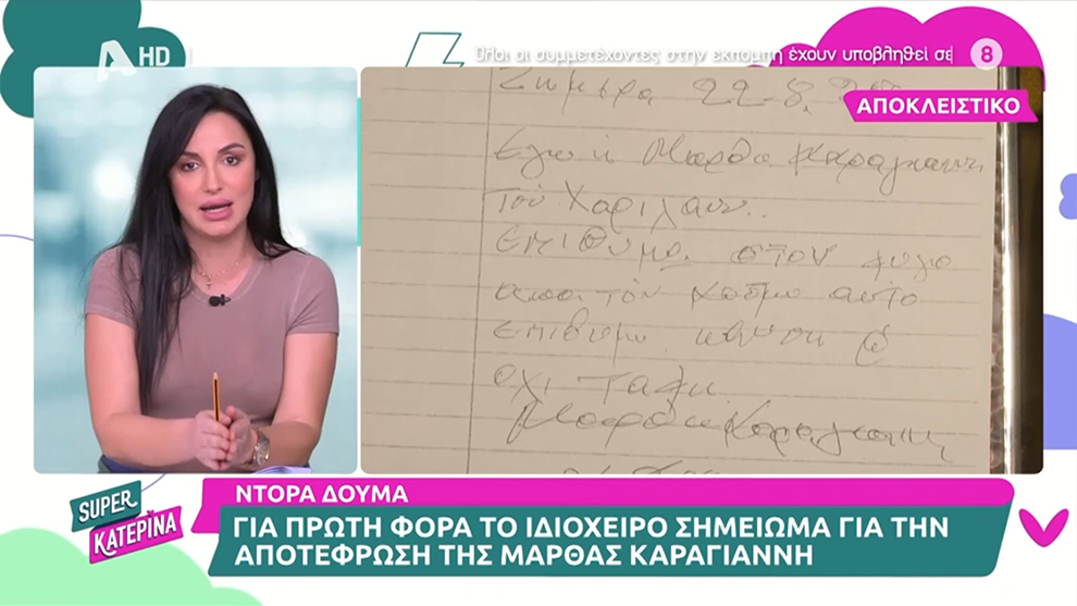 «Η Μάρθα πέθανε από καρδιά. Ξύπνησε το πρωί, έφαγε το πρωινό της αλλά δεν είχε τη διάθεση που είχε συνήθως. Πήρα τον γιατρό τον Σούρα, του λέω έτσι κι έτσι, της μίλησε, της λέει “πες μου αυτό κι αυτό”, του λέει “ναι, Δημήτρη μου” κι εκεί τελείωσε», περιέγραψε η Ντόρα Δούμα, ενώ έδειξε στην κάμερα το χειρόγραφο σημείωμα, με το οποίο η Μάρθα Καραγιάννη ζητούσε να αποτεφρωθεί.