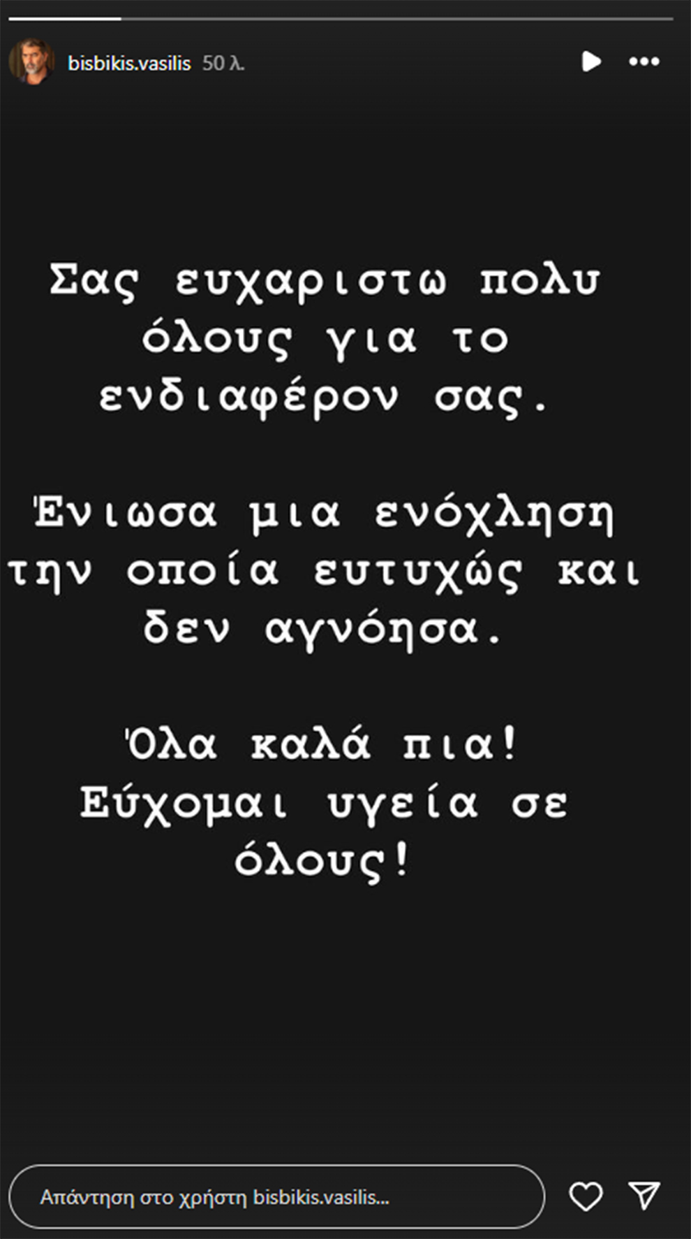 Ο Βασίλης Μπισμπίκης μετά την γνωστοποίηση της περιπέτειας που πέρασε με την υγεία του, «μίλησε» στους διαδικτυακούς του φίλους με ένα story στον προσωπικό του λογαριασμό στο Instagram.