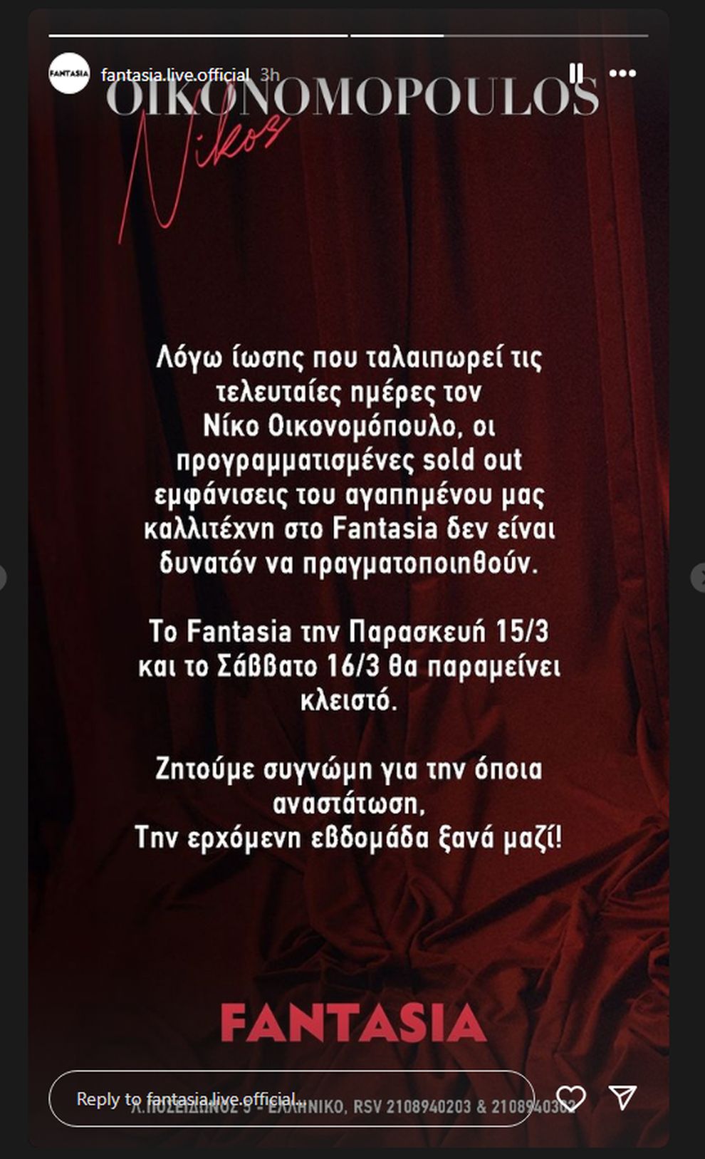 «Λόγω ίωσης που ταλαιπωρεί τις τελευταίες ημέρες τον Νίκο Οικονομόπουλο, οι προγραμματισμένες sold out εμφανίσεις του αγαπημένου μας καλλιτέχνη στο Fantasia δεν είναι δυνατόν να πραγματοποιηθούν. Το Fantasia την Παρασκευή 15/3 και το Σάββατο 16/3 θα παραμείνει κλειστό. Ζητούμε συγγνώμη για την όποια αναστάτωση. Την ερχόμενη εβδομάδα ξανά μαζί», ανέφερε χαρακτηριστικά η ανακοίνωση του νυχτερινού κέντρου.