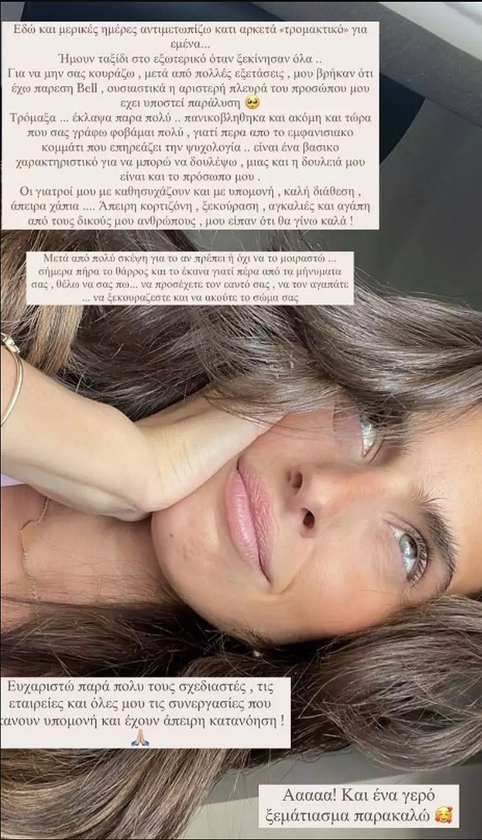 Έτσι, μέσα από τον προσωπικό της λογαριασμό στο Instagram, η Ιωάννα Σαρρή δημοσίευσε μια εικόνα σαν ιστορία στην οποία και έγραψε αναλυτικά τα παρακάτω. «Εδώ και μερικές ημέρες αντιμετωπίζω κάτι τρομακτικό για εμένα. Ήμουν ταξίδι στο εξωτερικό όταν ξεκίνησαν όλα… Για να μην σας κουράζω, μετά από πολλές εξετάσεις, μου βγήκαν ότι έχω πάρεση Bell. Oυσιαστικά η αριστερή πλευρά του προσώπου μου έχει υποστεί παράλυση».