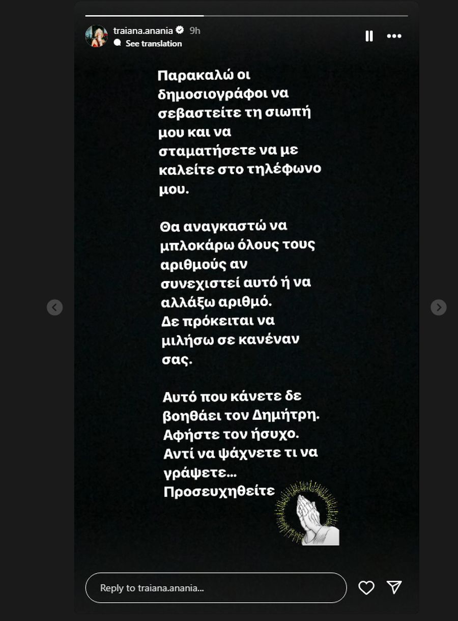 «Παρακαλώ οι δημοσιογράφοι να σεβαστείτε τη σιωπή μου και να σταματήσετε να με καλείτε στο τηλέφωνό μου. Θα αναγκαστώ να μπλοκάρω όλους τους αριθμούς αν συνεχιστεί αυτό ή να αλλάξω αριθμό. Δεν πρόκειται να μιλήσω σε κανέναν σας. Αυτό που κάνετε δε βοηθάει τον Δημήτρη. Αφήστε τον ήσυχο. Αντί να ψάχνετε τι να γράψετε…Προσευχηθείτε», έγραψε στην ανάρτησή της.