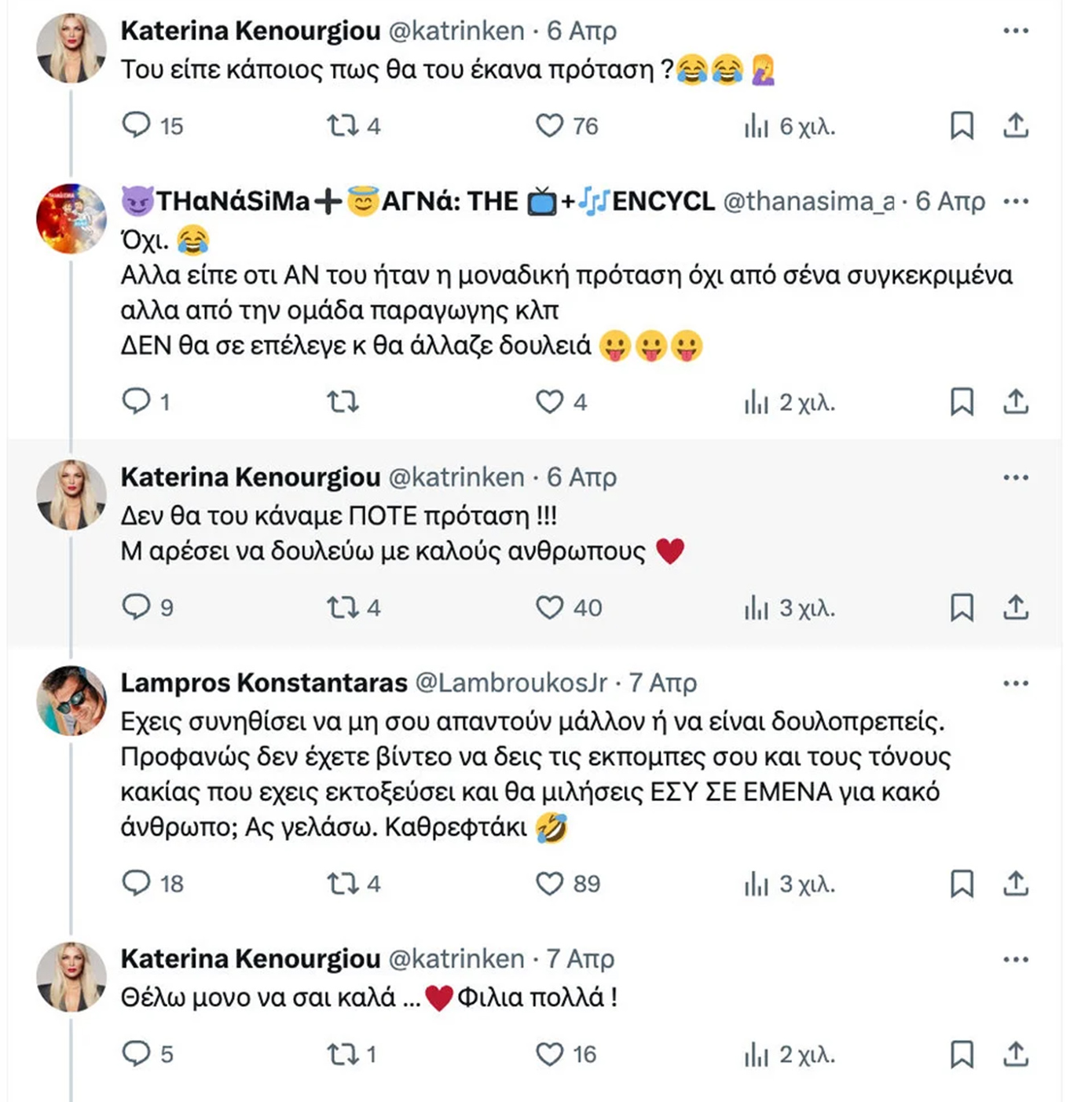 «Του είπε κάποιος πως θα του έκανα πρόταση;» ήταν το σχόλιο της Κατερίνας Καινούργιου στο twitter. «Δεν θα του κάναμε ΠΟΤΕ πρόταση! Μ’ αρέσει να δουλεύω με καλούς ανθρώπους», συμπλήρωσε η παρουσιάστρια του «Alpha».