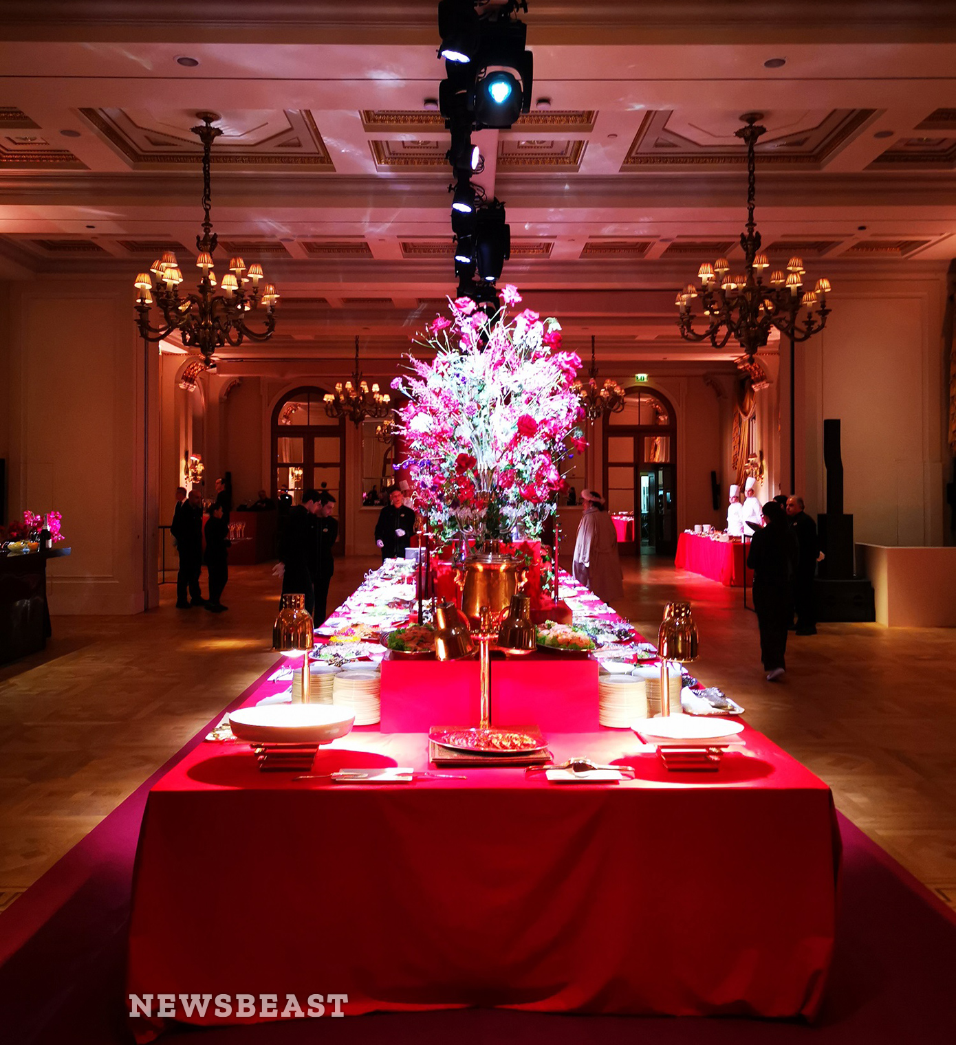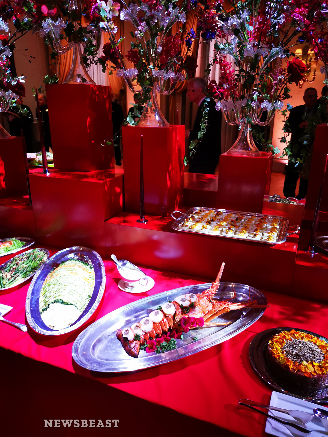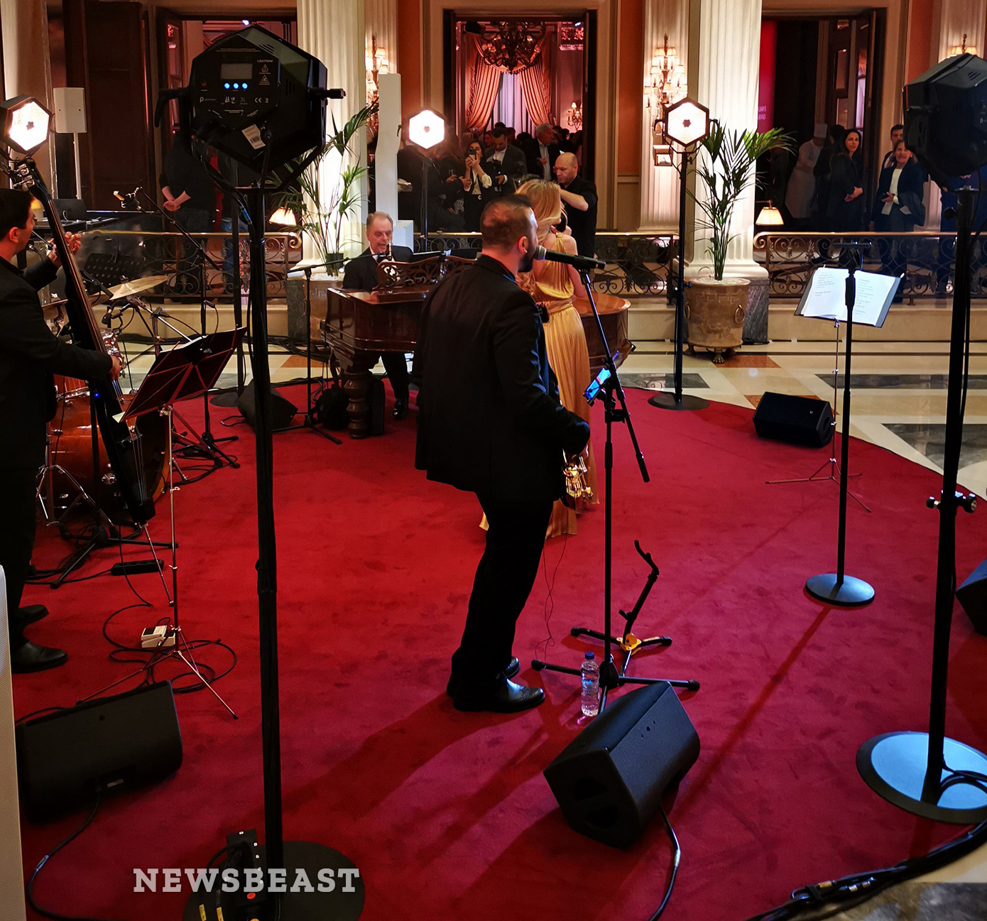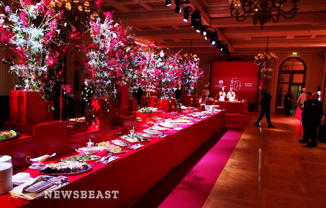 Στο ισόγειο της «Μεγάλης Βρεταννίας», όπου πραγματοποιήθηκε η λαμπερή δεξίωση, υπήρχε ζωντανή μουσική καθώς και επίδειξη μόδας. Ο στολισμός ήταν εντυπωσιακός και το κόκκινο χρώμα ήταν ο πρωταγωνιστής της βραδιάς.