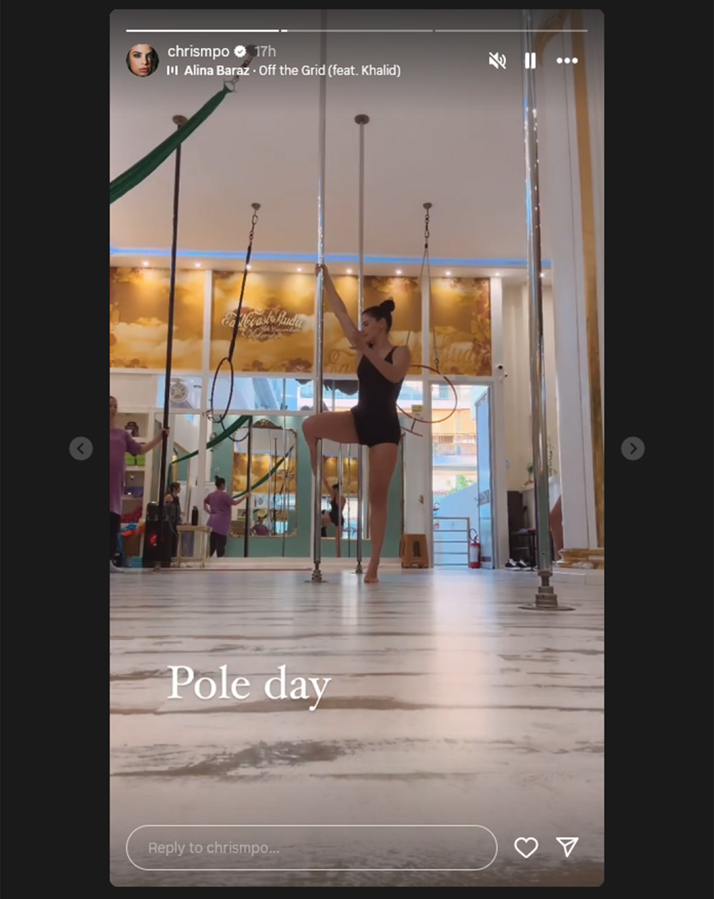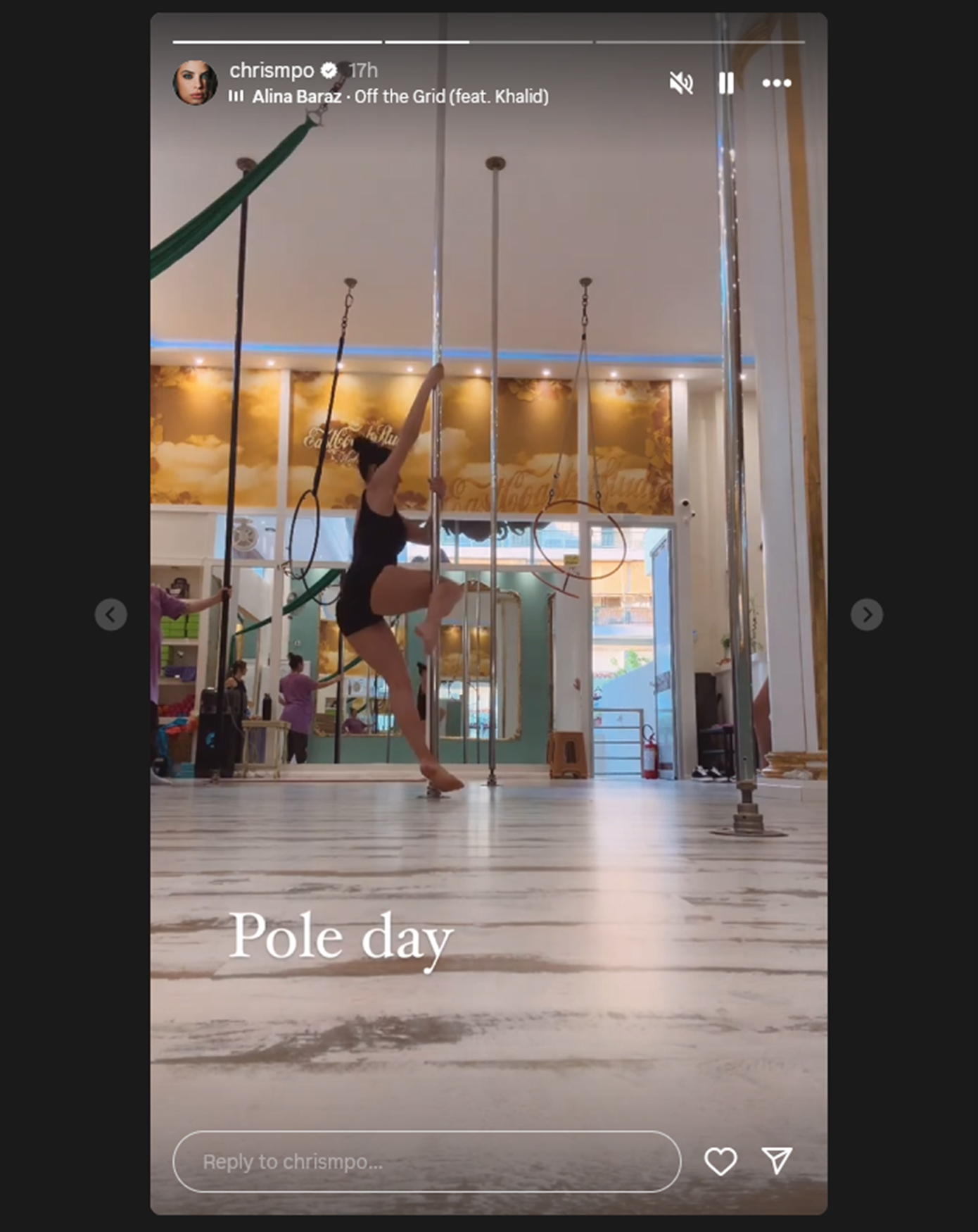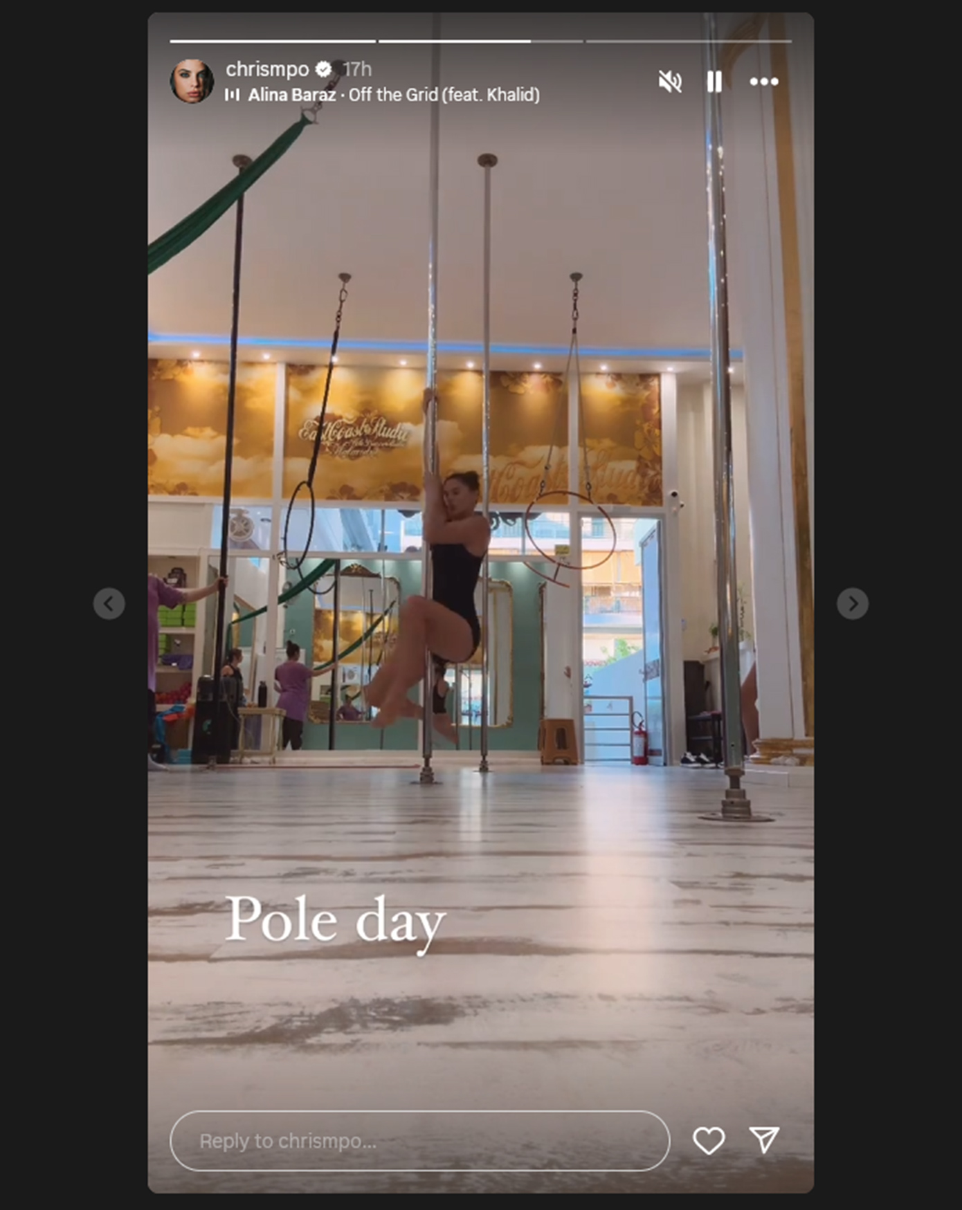 Η Χριστίνα Μπόμπα μοιράστηκε με τους φίλους της στο Instagram, ένα νέο βίντεο με την ίδια να κάνει pole dancing. Η influencer και σύζυγος του Σάκη Τανιμανίδη ανέβασε ένα βίντεο σε story, στο οποίο λικνίζεται πάνω στον στύλο.