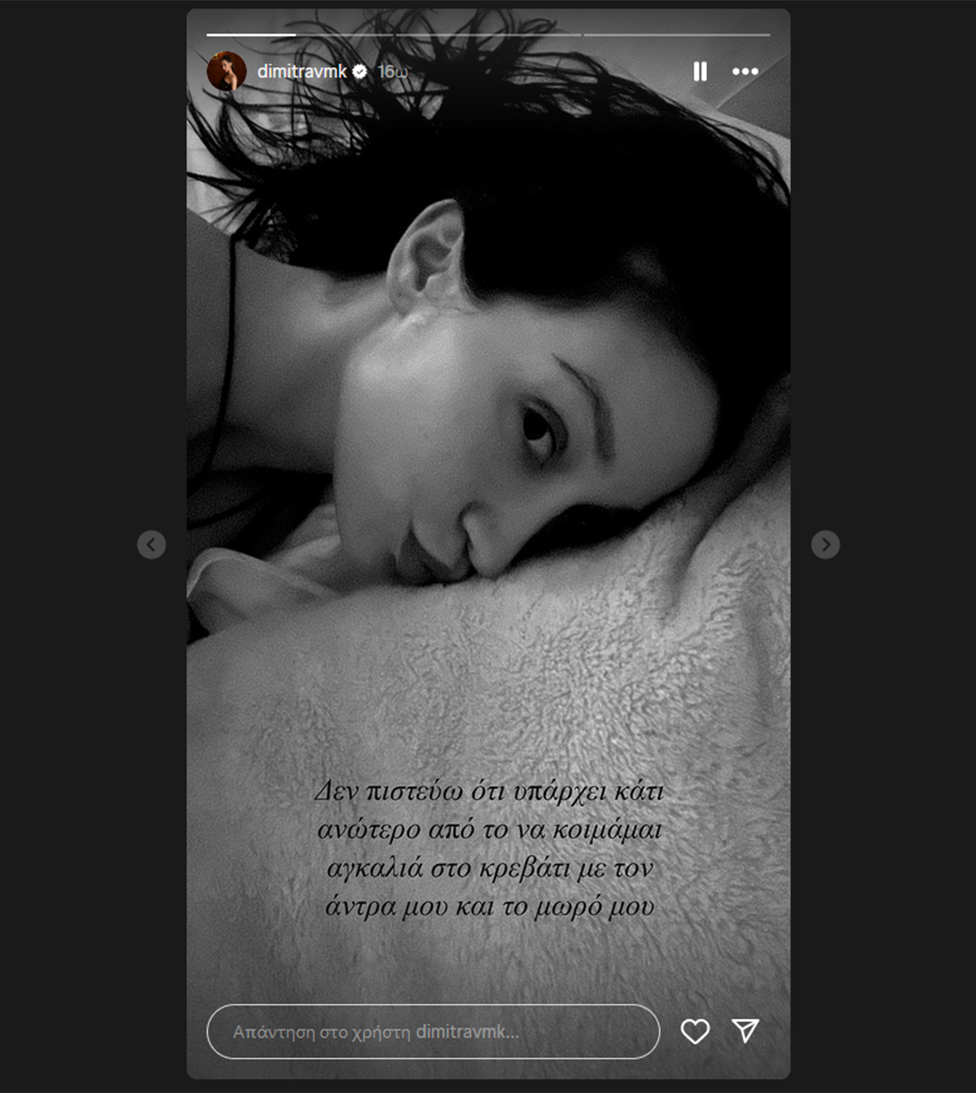 Μέσω Instagram story, η Δήμητρα Βαμβακούση ανέβασε ένα ασπρόμαυρο στιγμιότυπο με την ίδια να είναι ξαπλωμένη στο κρεβάτι, που βρισκόταν και ο σύζυγος με το παιδί της.