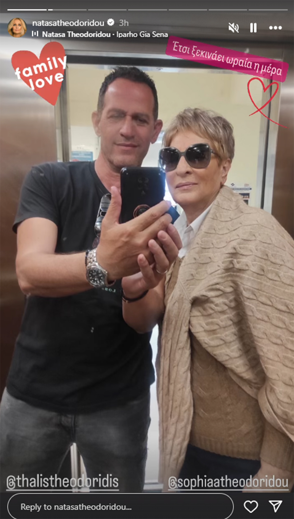 Αυτή τη φορά, η Νατάσα Θεοδωρίδου ξεκίνησε τη μέρα της με μία φωτογραφία του αδελφού της, Θαλή και της μητέρας της, Σοφίας. Οι δυο τους ποζάρουν στο ασανσέρ με τη Νατάσα Θεοδωρίδου να σημειώνει: «Έτσι ξεκινάει ωραία η μέρα».