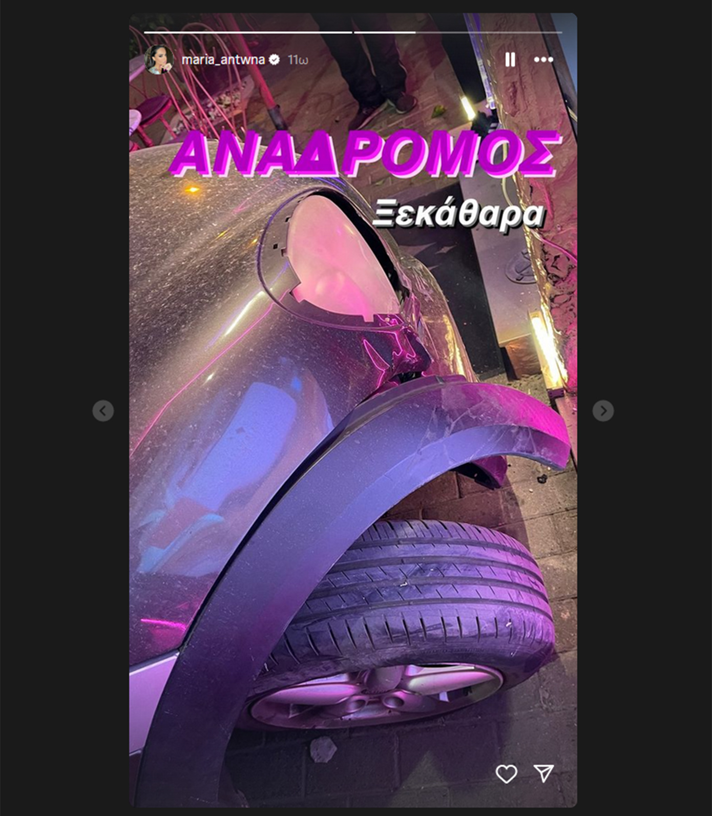 «Ανάδρομος Ξεκάθαρα» σημείωσε στη φωτογραφία που δημοσίευσε η ίδια στα Instagram Stories με το τρακαρισμένο αυτοκίνητό της.