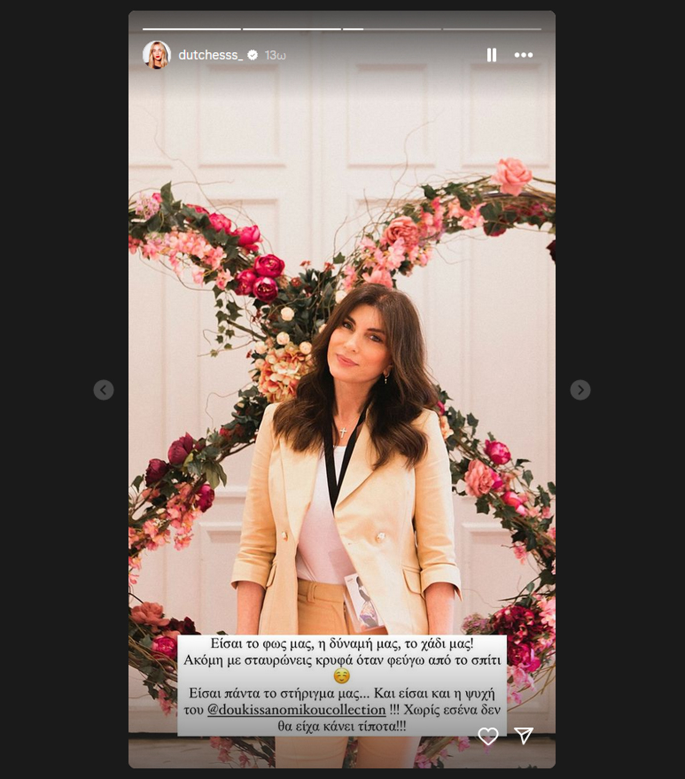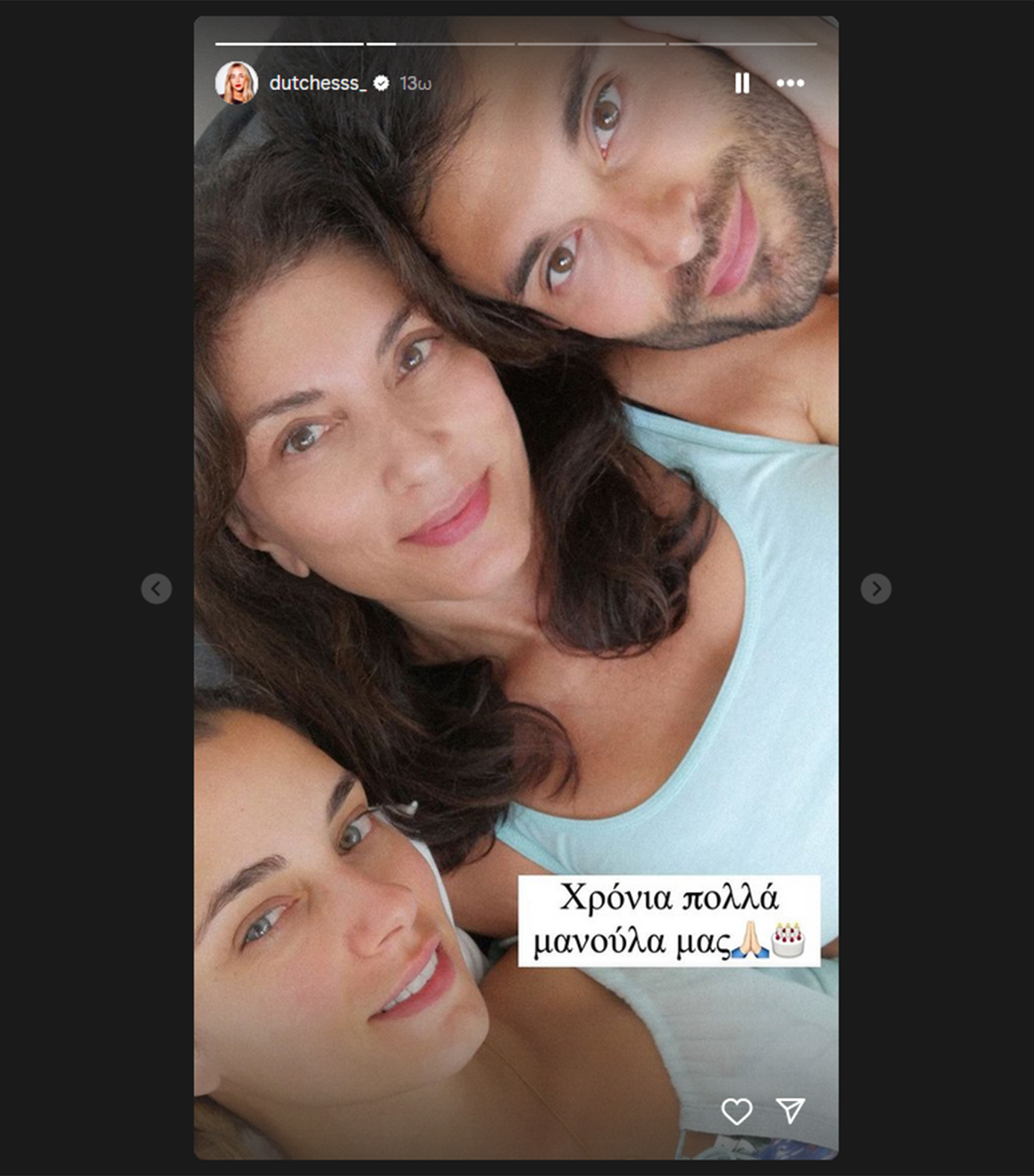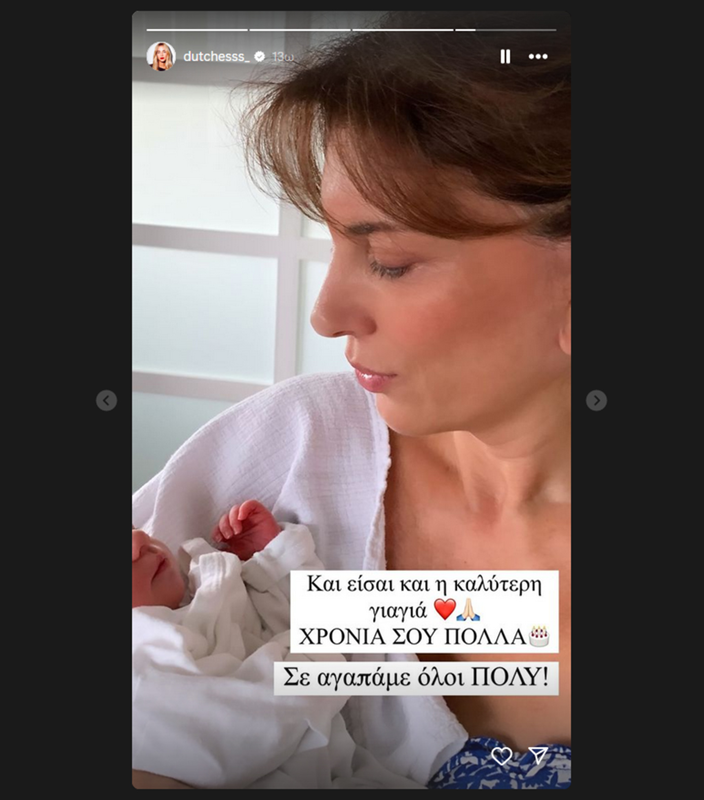 H Δούκισσα Νομικού δημοσίευσε τρεις φωτογραφίες της μητέρας της και έγραψε: «Χρόνια πολλά μανούλα μας! Είσαι το φως μας, η δύναμή μας, το χάδι μας! Ακόμη με σταυρώνεις κρυφά όταν φεύγω από το σπίτι. Είσαι πάντα το στήριγμά μας. Και είσαι και η ψυχή του @doukissanomikoucollection. Χωρίς εσένα δεν θα είχα κάνει τίποτα. Και είσαι και η καλύτερη γιαγιά! Χρόνια σου πολλά! Σε αγαπάμε όλοι πολύ!».