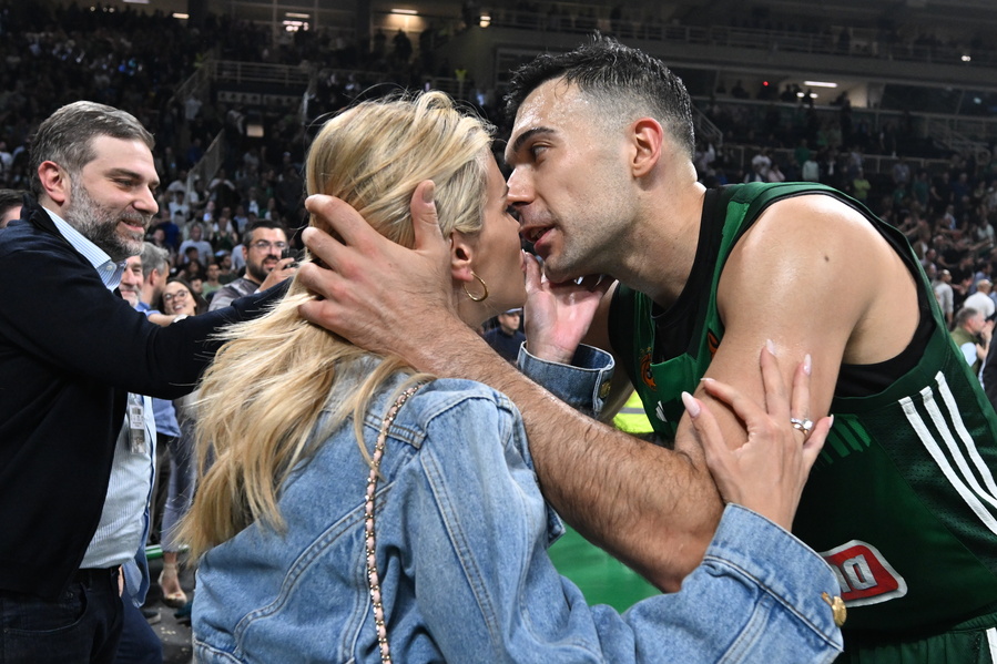 Στην αγκαλιά της συζύγου του, Μαρίνας Δαρσινού, έπεσε ο Κώστας Σλούκας μετά την εμφάνισή του που χάρισε τη νίκη στον Παναθηναϊκό επί της Μακάμπι ισοφαρίζοντας σε 1-1 τη σειρά των play off της Euroleague.