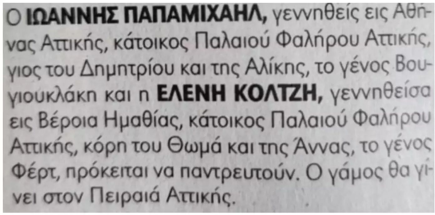 Όπως χαρακτηριστικά αναφέρεται στην αναγγελία γάμος που δημοσιεύθηκε και στο zappit, ο γάμος θα γίνει στον Πειραιά.