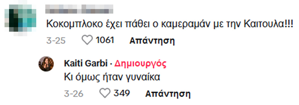 Όπως αποκάλυψε η Καίτη Γαρμπή απαντώντας σε follower, δεν κρυβόταν άντρας πίσω από την κάμερα, αλλά γυναίκα.