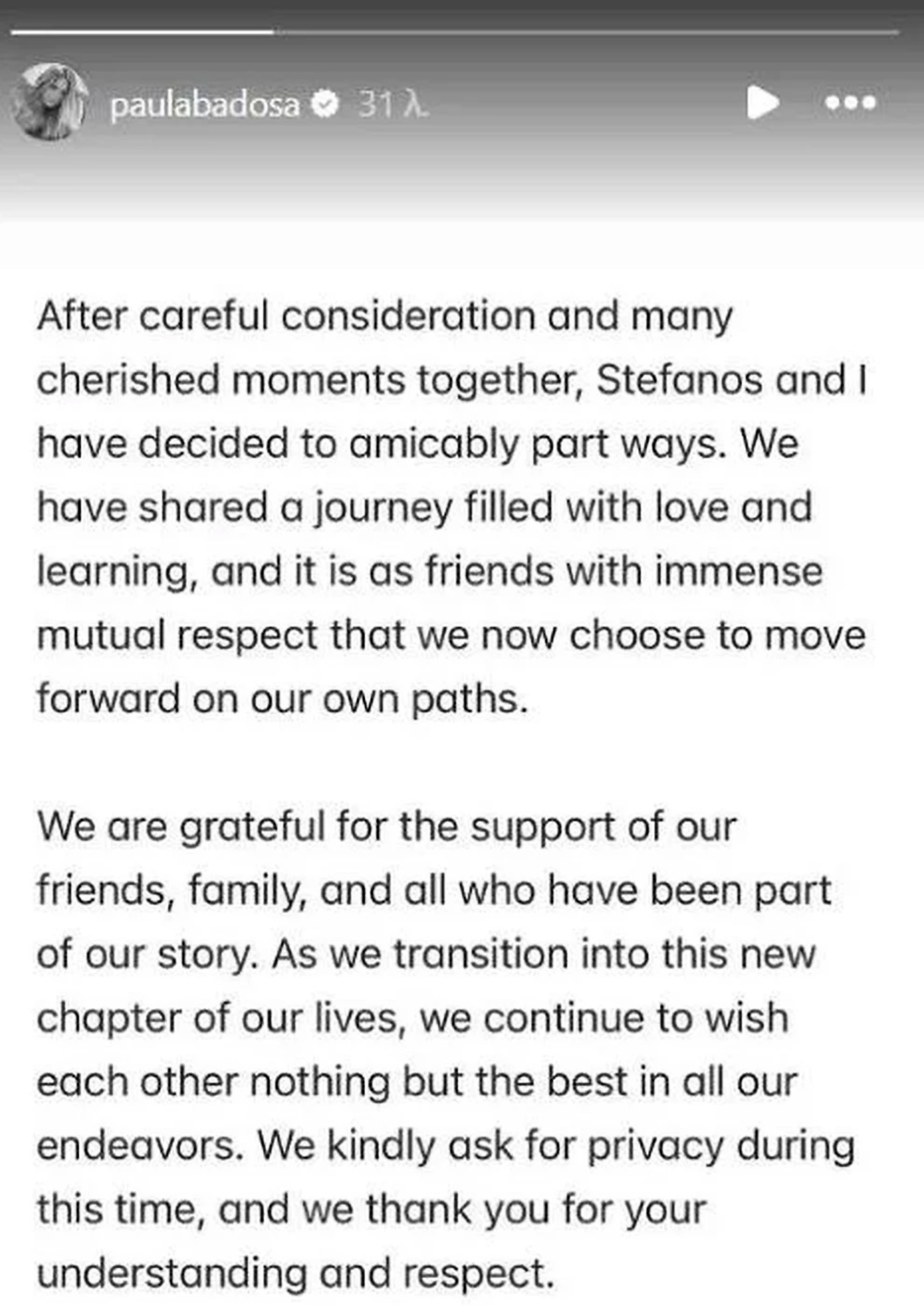 «Ύστερα από προσεκτική σκέψη και πολλές όμορφες στιγμές μαζί, ο Στέφανος και εγώ αποφασίσαμε να χωρίσουμε φιλικά τους δρόμους μας. Μοιραστήκαμε ένα ταξίδι γεμάτο αγάπη και μάθηση, και ως φίλοι με αμοιβαίο σεβασμό επιλέγουμε τώρα να προχωρήσουμε στα δικά μας μονοπάτια. Είμαστε ευγνώμονες για την υποστήριξη των φίλων μας, των οικογενειών μας και όλων όσοι υπήρξαν μέρος της ιστορίας μας. Καθώς μεταβαίνουμε σε αυτό το νέο κεφάλαιο της ζωής μας, συνεχίζουμε να ευχόμαστε ο ένας στον άλλον μόνο τα καλύτερα σε όλες τις προσπάθειές μας. Ζητάμε ευγενικά την προστασία της ιδιωτικής μας ζωής κατά τη διάρκεια αυτής της περιόδου και σας ευχαριστούμε για την κατανόηση και τον σεβασμό σας».