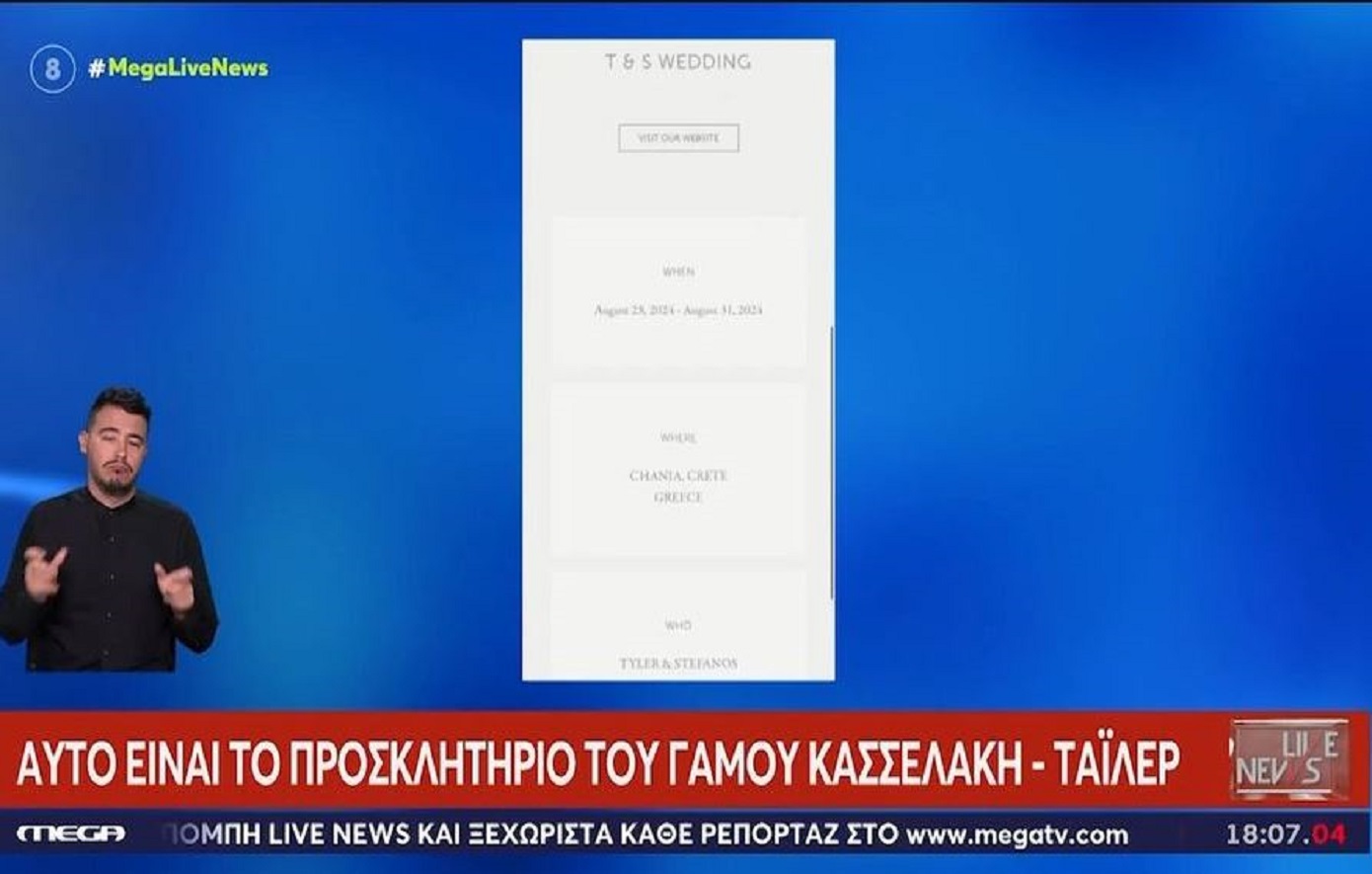 Το προσκλητήριο για τον γάμο του Στέφανου Κασσελάκη και του Τάιλερ Μάκμπεθ παρουσίασε η εκπομπή του «MEGA», «LIVE News».