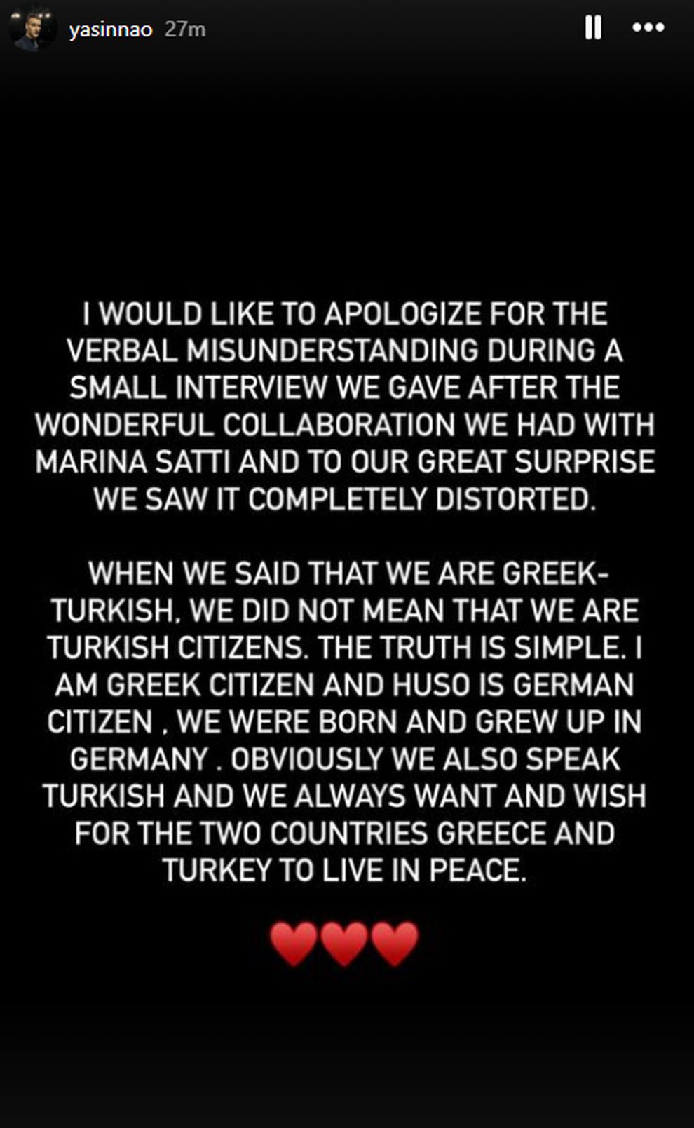 «Όταν είπαμε ότι είμαστε Έλληνες Τούρκοι δεν εννοούσαμε ότι είμαστε τούρκοι πολίτες. Η αλήθεια είναι απλή. Εγώ είμαι έλληνας πολίτης και ο Huso είναι γερμανός πολίτης. Γεννηθήκαμε και μεγαλώσαμε στη Γερμανία. Προφανώς μιλάμε και τούρκικα και πάντα θέλουμε και ευχόμαστε οι δύο χώρες, Ελλάδα και Τουρκία, να ζουν με ειρήνη», αναφέρει, μεταξύ άλλων.