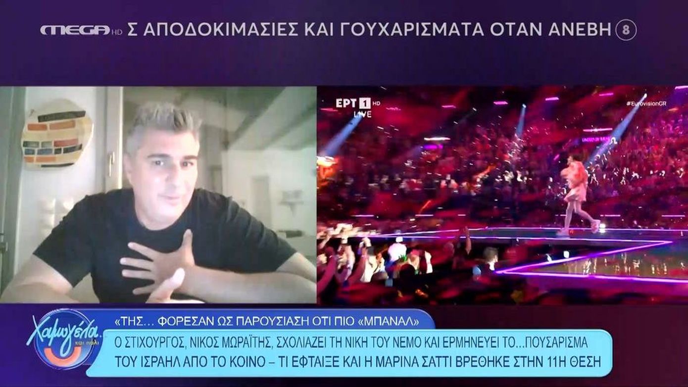 Την άποψή του για τον φετινό διαγωνισμό της Eurovision εξέφρασε ο στιχουργός Νίκος Μωραΐτης ο οποίος παραχώρησε δηλώσεις στην κάμερα της εκπομπής «Χαμογέλα και πάλι» του Mega. Ο στιχουργός δεν έκρυψε την έκπληξή του για τους βαθμούς που συγκέντρωσε η ισραηλινή Eden Golan παρά τις διαμαρτυρίες που υπήρχαν για την συμμετοχή της στον διαγωνισμό.