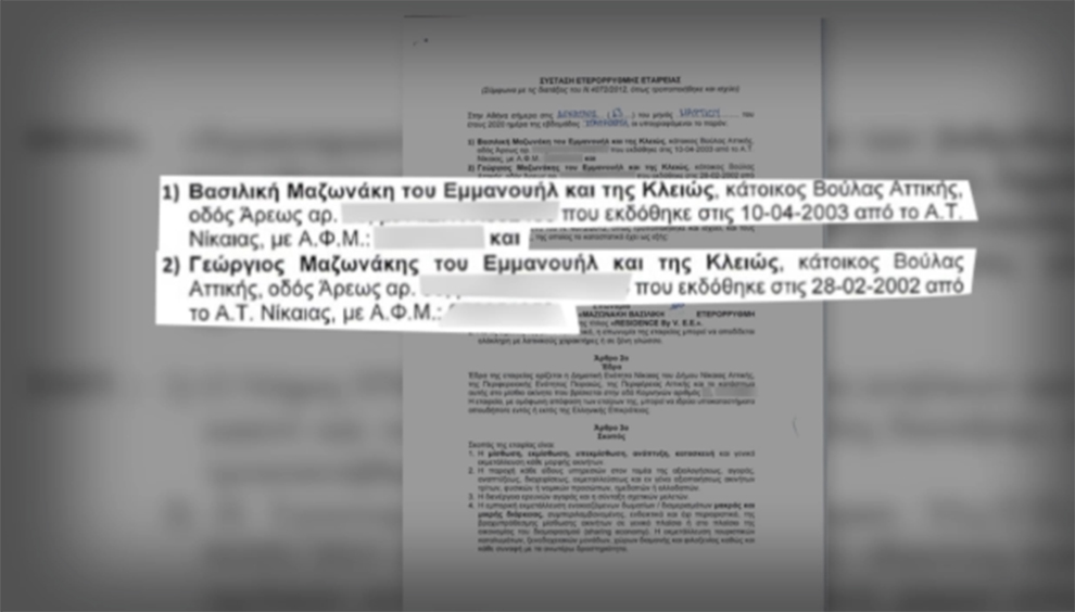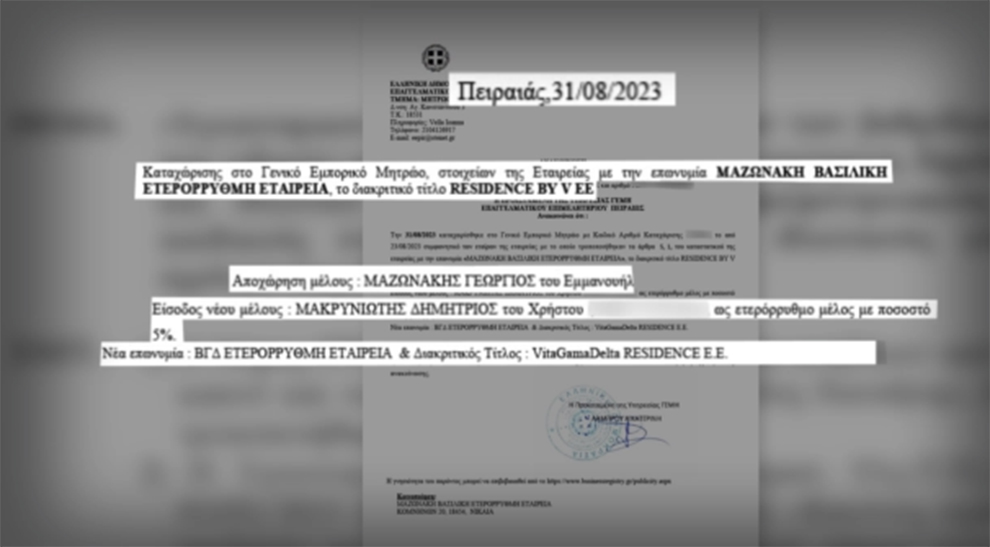 Η εταιρεία, σύμφωνα πάντα με την εκπομπή του Mega, δημιουργήθηκε τον Μάρτιο του 2020 στον Πειραιά με μετόχους τη Βασιλική Μαζωνάκη(90%) και ο Γιώργος Μαζωνάκης(10%) με τίτλο «Residence by V EE».