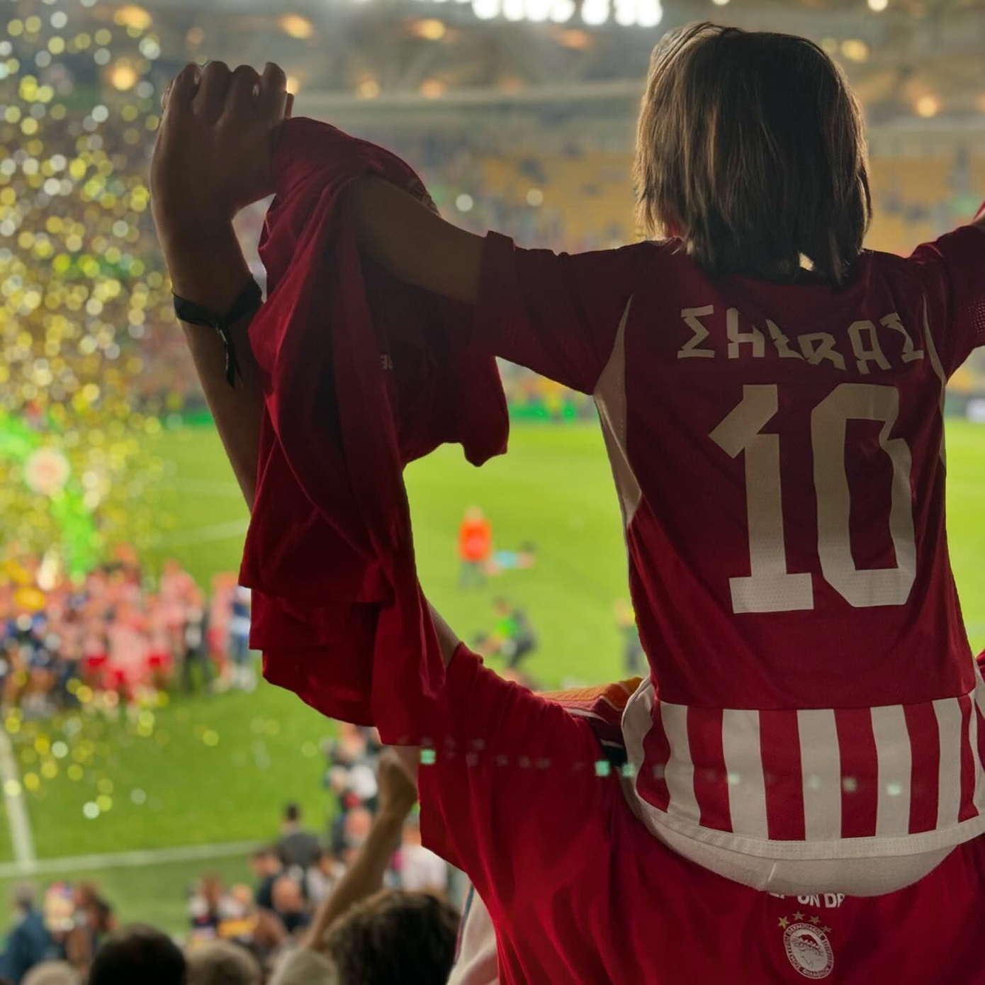 Στις φωτογραφίες βλέπουμε τον μικρό Σάββα να πανηγυρίζει τη νίκη του Ολυμπιακού φορώντας τη φανέλα του ερυθρόλευκου με το όνομα του παππού του, Σάββας.