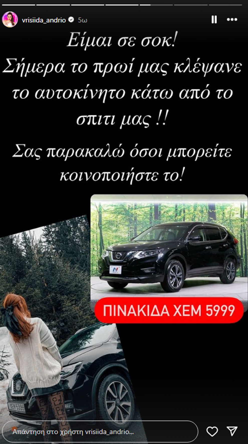 «Είμαι σε σοκ! Σήμερα το πρωί μας κλέψανε το αυτοκίνητο κάτω από το σπίτι μας. Σας παρακαλώ όσοι μπορείτε κοινοποιήστε το» έγραψε χαρακτηριστικά στην ανάρτησή της η Βρισηίδα Ανδριώτου.