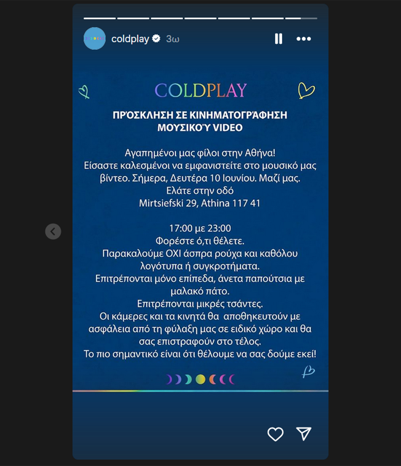 Οι Coldplay καλούν, μέσω μηνύματος στο Instagram, όσους θέλουν να συμμετάσχουν στο βιντεοκλίπ που θα πραγματοποιήσουν στο Ηρώδειο.