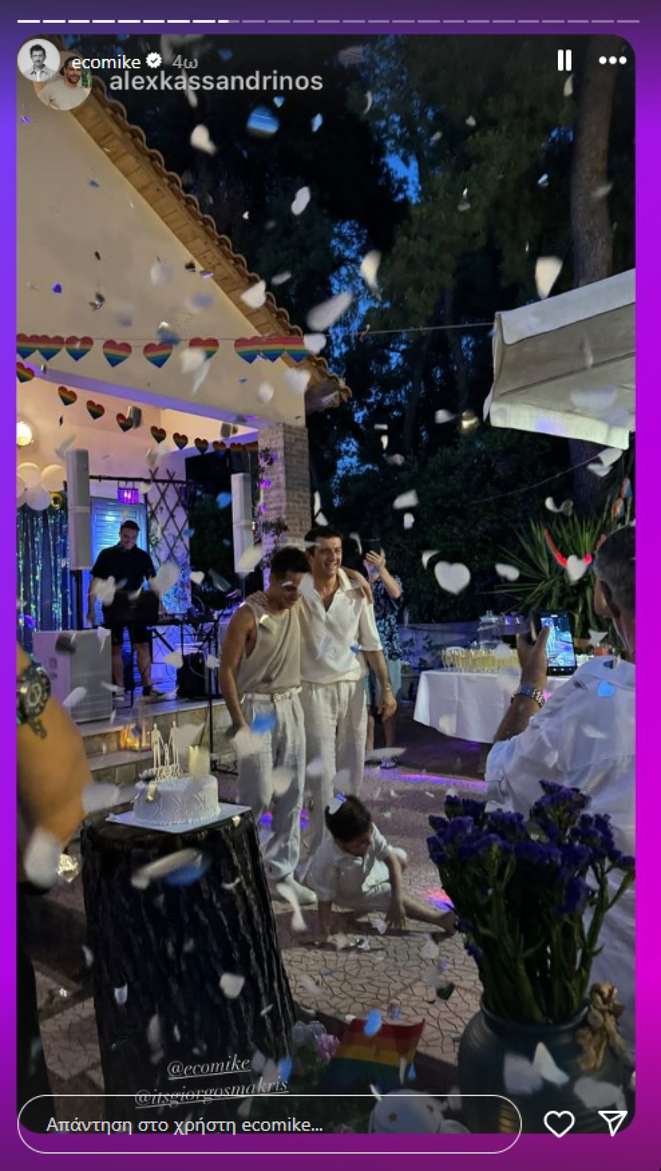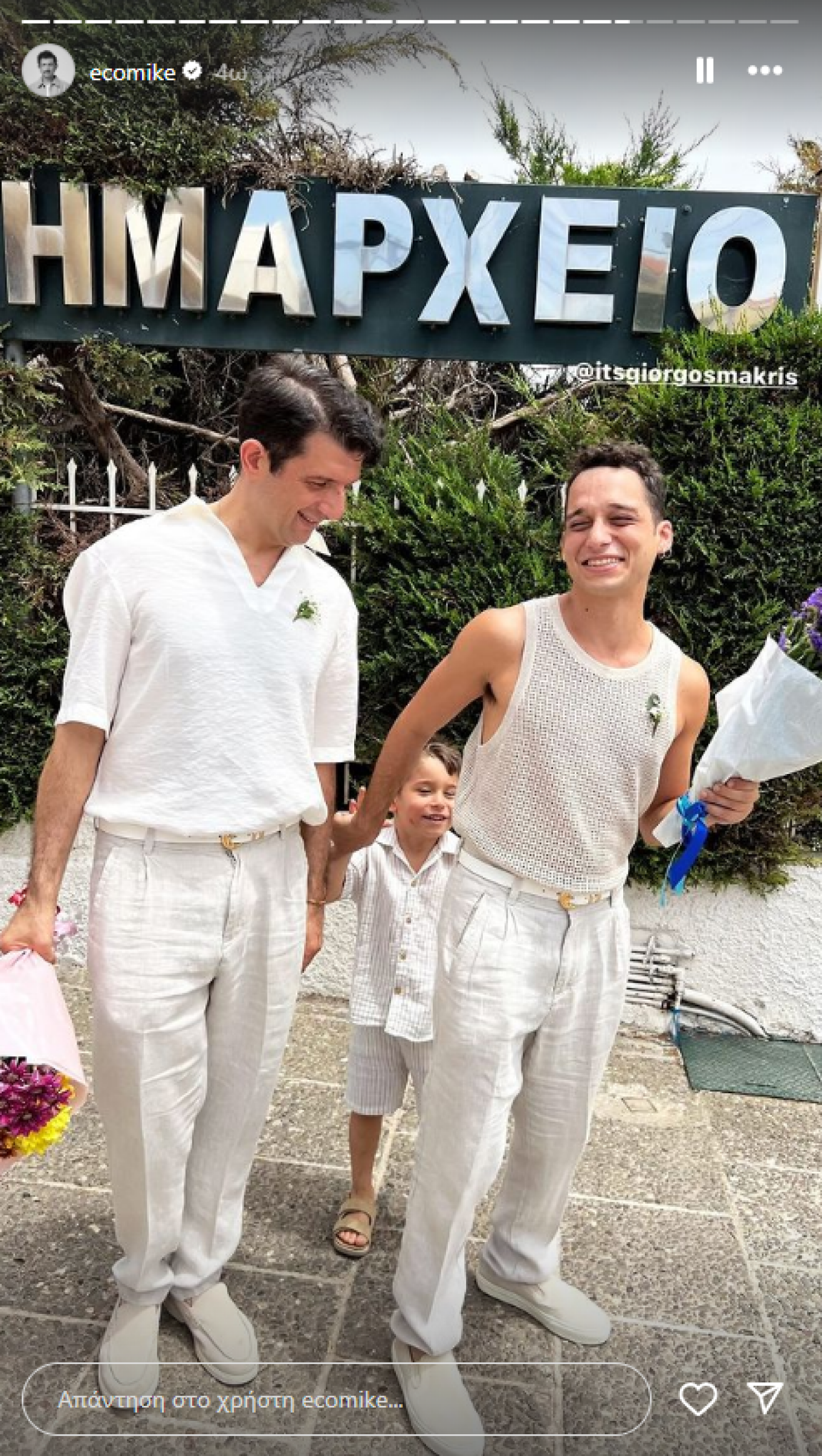 Χαρές για τον ηθοποιό Mιχάλη Οικονόμου που το βράδυ της Παρασκευής (14/6) παντρεύτηκε με πολιτικό γάμο τον σύντροφό του, Γιώργο Μακρή.