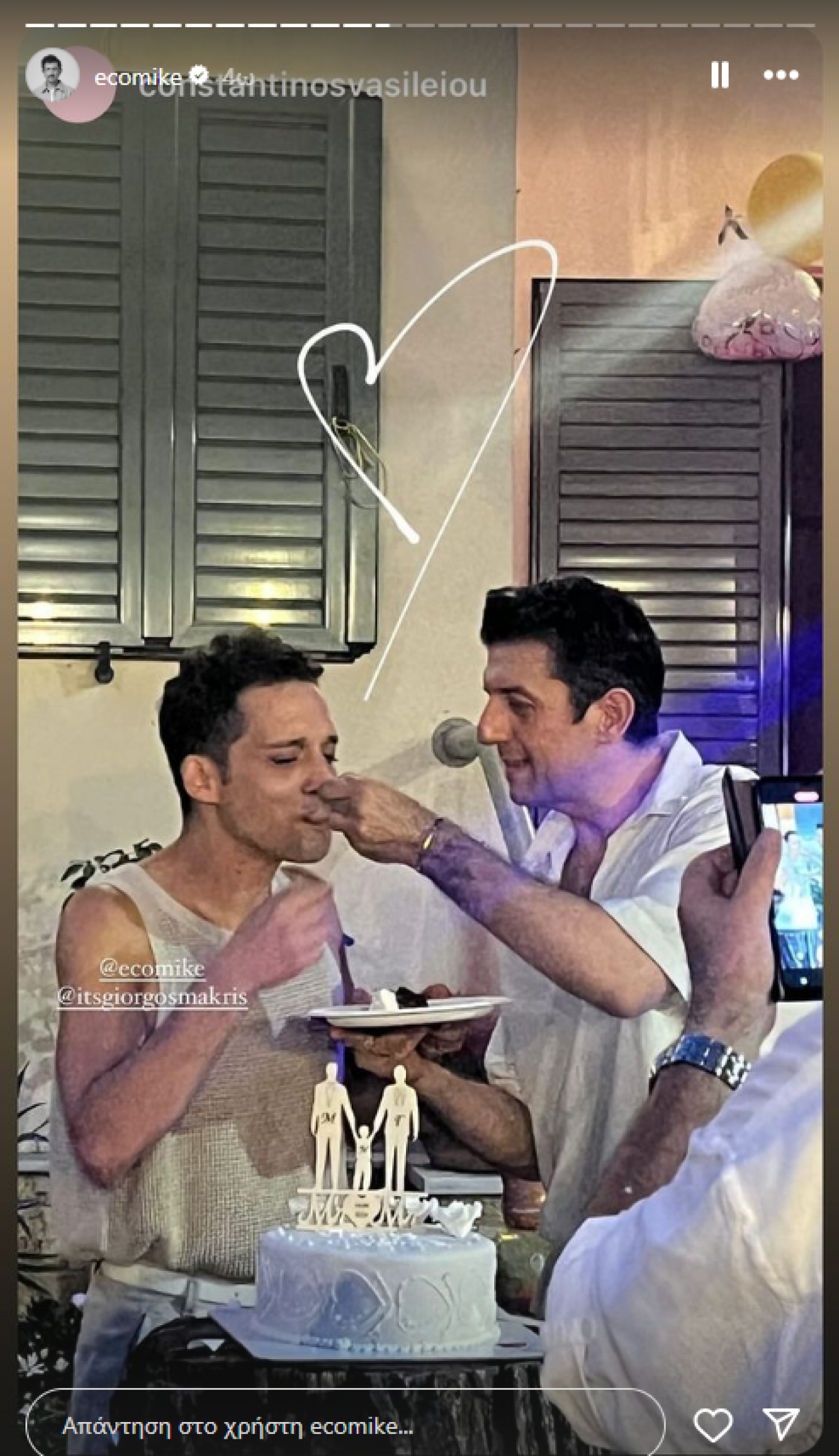 Ο Μιχάλης Οικονόμου έκανε γνωστό το χαρμόσυνο γεγονός στα κοινωνικά δίκτυα, δημοσιεύοντας φωτογραφία στην οποία εικονίζεται με τον σύζυγό του μπροστά από τη γαμήλια τούρτα τους.