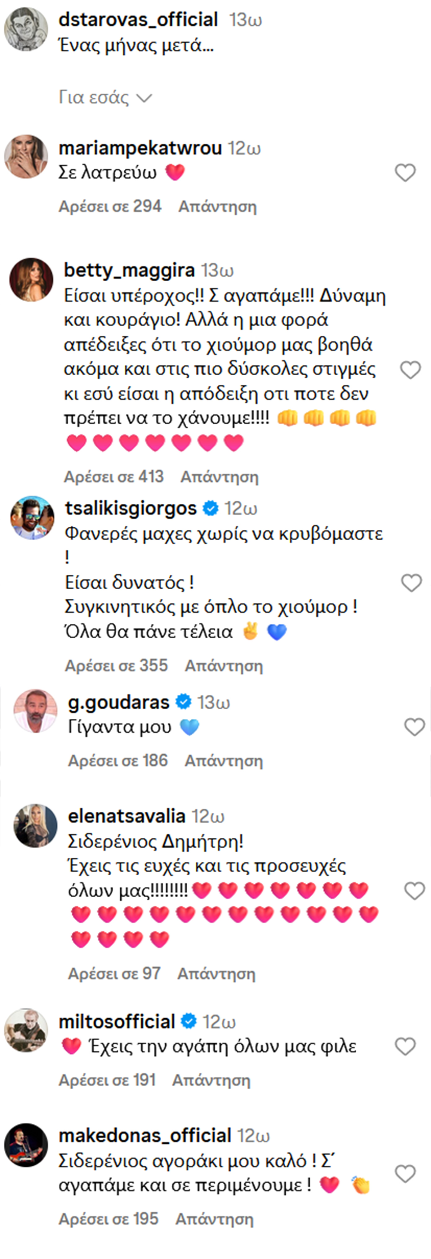«Σιδερένιος φίλε!! Μη μασάς!!!!!! Σε αγαπάμε όλοι», του έγραψε ο Γεράσιμος Σκιαδαρέσης. «Είσαι υπέροχος! Σε αγαπάμε!!! Δύναμη και κουράγιο! Άλλη μια φορά απέδειξες ότι το χιούμορ μάς βοηθά ακόμα και στις πιο δύσκολες στιγμές κι εσύ είσαι η απόδειξη ότι ποτέ δεν πρέπει να το χάνουμε!!!!», ήταν το μήνυμα από την Μπέτυ Μαγγίρα.