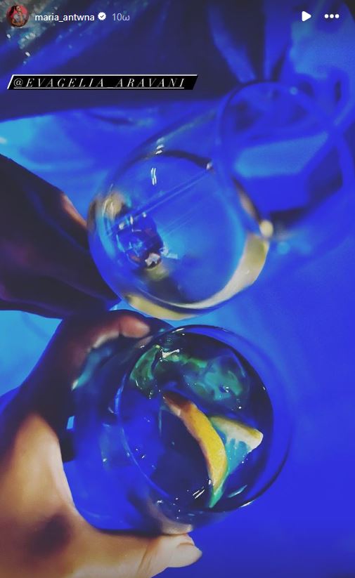 Από την πλευρά της η Μαρία Αντωνά πόσταρε μια φωτογραφία με δυο ποτήρια κρασιού επισημαίνοντας στην φωτογραφία την Ευαγγελία Αραβανή η οποία είναι σύντροφος του ιδιοκτήτη του ξενοδοχείου.