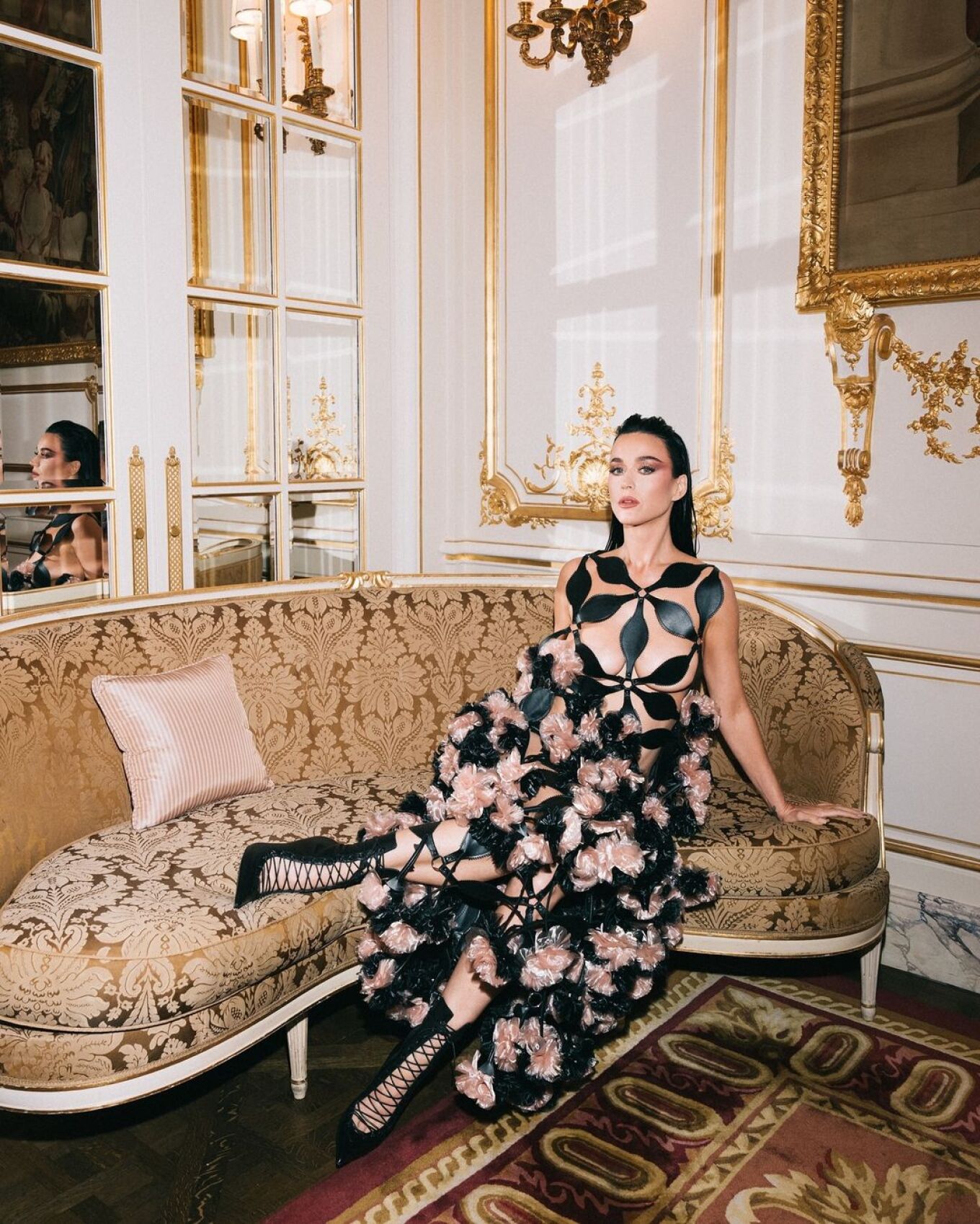 Πρόκειται για ένα φόρεμα με γεωμετρικά σχέδια και πολλά ανοίγματα μαζί με μια πληθώρα λουλουδιών για στόλισμα.