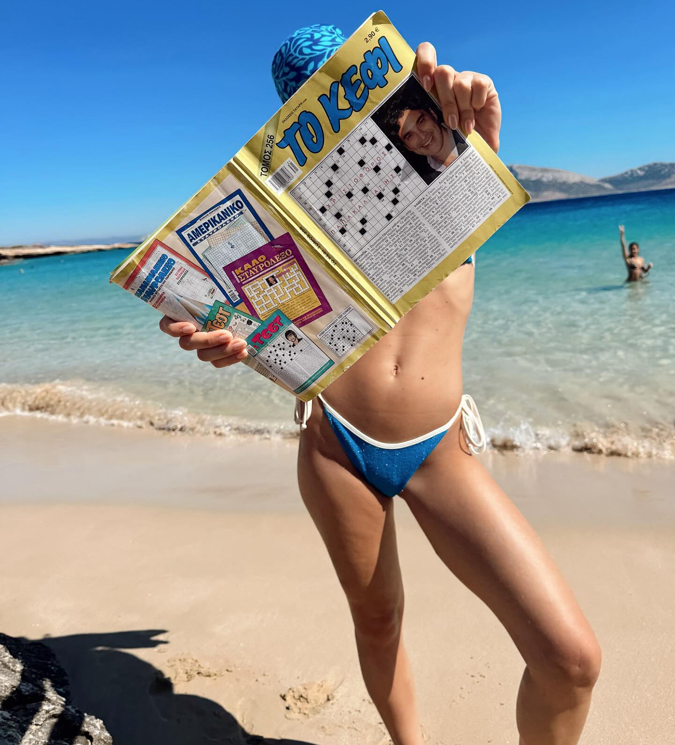 Στις φωτογραφίες, η ηθοποιός κρατά ένα σταυρόλεξο που έχει στο εξώφυλλό του τον Χριστόφορο Παπακαλιάτη. Στη λεζάντα της δημοσίευσής της σημείωσε: «Το crush μου • 7 γράμματα».