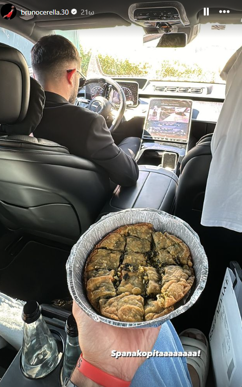 Από το δικό του προφίλ, ο Τσερέλα ανέβασε αρχικά μια φωτογραφία του μέσα στο αυτοκίνητο που ταξιδεύει με προορισμό το νησί, στην οποία αποθεώνει ένα κομμάτι σπανακόπιτα.