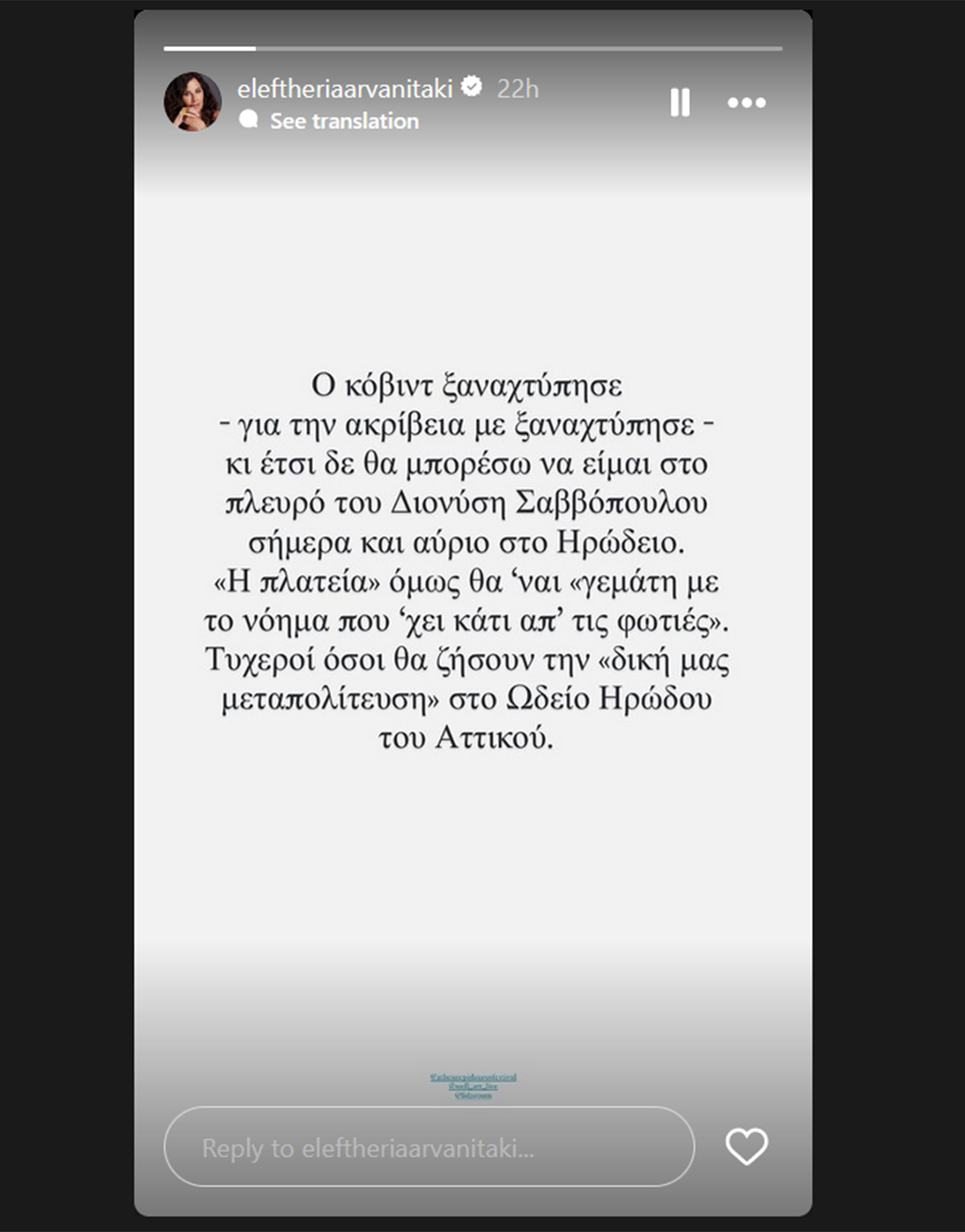 «Ο κόβιντ ξαναχτύπησε -για την ακρίβεια με ξαναχτύπησε- κι έτσι δεν θα μπορέσω να είμαι στο πλευρό του Διονύση Σαββόπουλου σήμερα και αύριο στο Ηρώδειο. “Η πλατεία όμως θα ΄ναι γεμάτη με το νόημα που ΄χει κάτι από τις φωτιές”. Τυχεροί όσοι θα ζήσουν τη «δική μας μεταπολίτευση» στο Ωδείο Ηρώδου του Αττικού», έγραψε χαρακτηριστικά η Ελευθερία Αρβανιτάκη στην ανάρτησή της.
