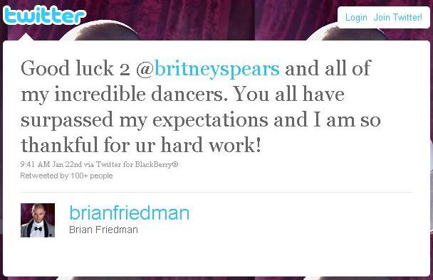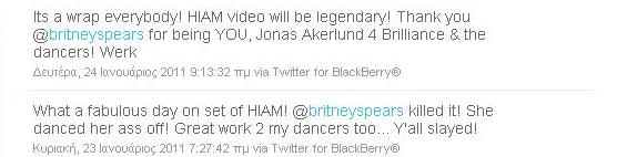 «Καλή τύχη στη Britney Spears και σε όλους τους καταπληκτικούς χορευτές που συμμετέχουν στο κλιπ. Είμαι ευγνώμων για τη σκληρή σας δουλειά. Ξεπεράσατε όλοι τις προσδοκίες μου». Χτες, ανέβασε το εξής μήνυμα: «Τι υπέροχα που ήταν κατά τη διάρκεια των γυρισμάτων. Η Britney τα έδωσε όλα…».