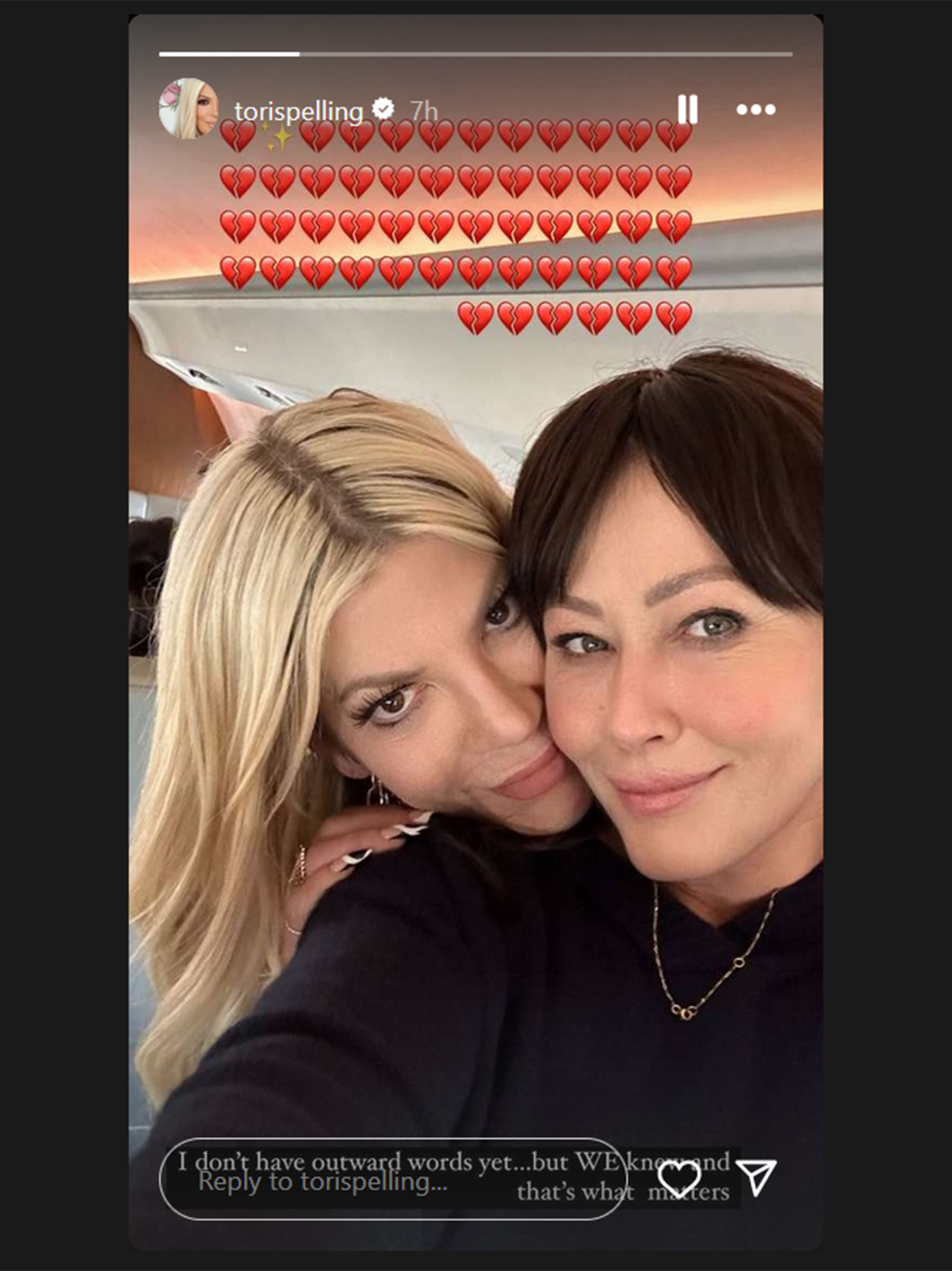 Με τη σειρά της και η Τόρι Σπέλινγκ, η «Ντόνα» του «Μπέβερλι Χιλς», αποχαιρέτησε την ηθοποιό. Η ίδια δημοσίευσε σε ένα story στο Instagram μια φωτογραφία που ποζάρουν αγκαλιά και έγραψε: «Δεν έχω ακόμη τα λόγια να το εκφράσω, αλλά εμείς ξέραμε, και αυτό είναι που μετράει».